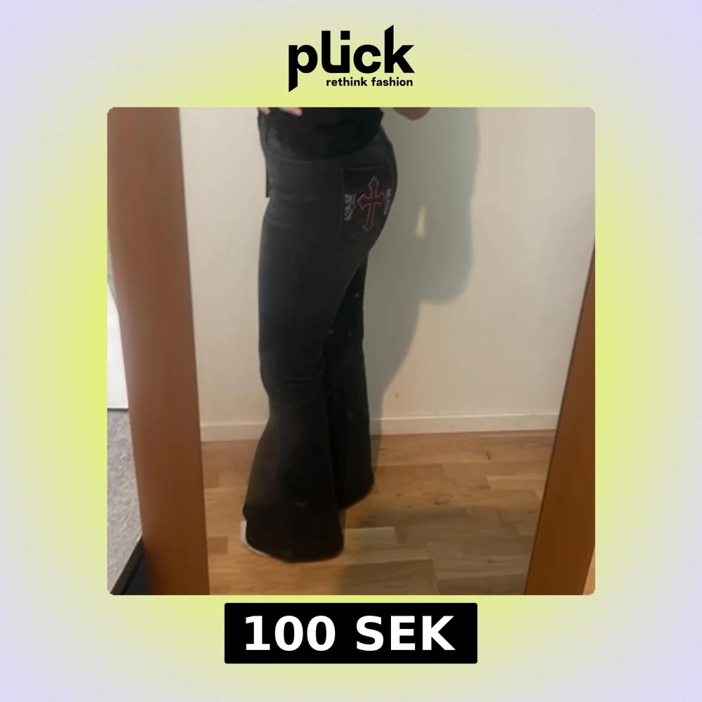 Säljer ett par svarta bootcut byxor med snygg broderad ficka bak, ett rött kors och vita detaljer. Byxorna har en klassisk bootcut passform som sitter tajt upptill och släpper ut vid benen. Helt oanvända men för högmidjade för min smak.