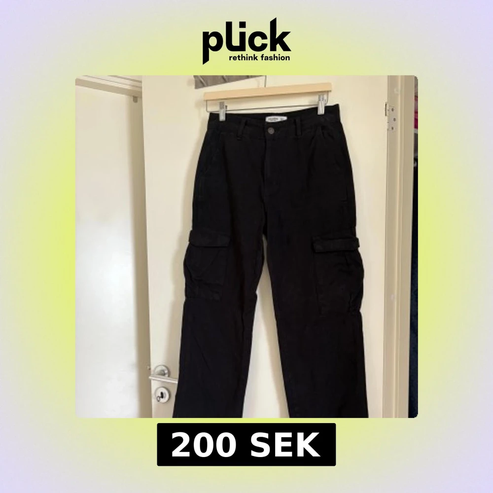 Säljer ett par svarta cargobyxor med stora fickor på sidorna och klassisk passform. Byxorna har knapp och dragkedja i midjan samt bälteshällor. Perfekta för en avslappnad och trendig stil.