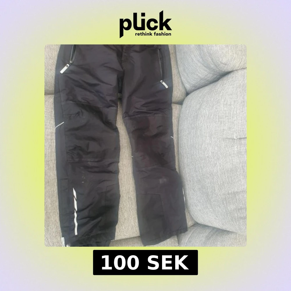 Svarta täckbyxor med dragkedjor vid fickorna och reflexdetaljer på benen. Perfekta för kalla dagar och vinteraktiviteter. Byxorna har en rak passform och är tillverkade i ett syntetmaterial som står emot väta och kyla.