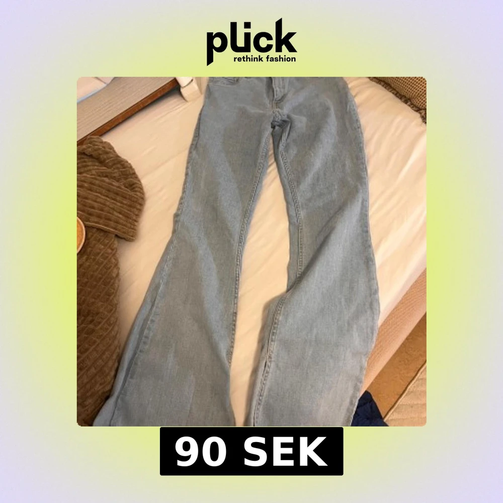 Säljer ett par ljusblå jeans med bootcut passform och slits nertill på benen. Jeansen har klassisk femficksdesign och är tillverkade i mjukt denimtyg. Perfekta för dig som gillar en avslappnad och trendig look.