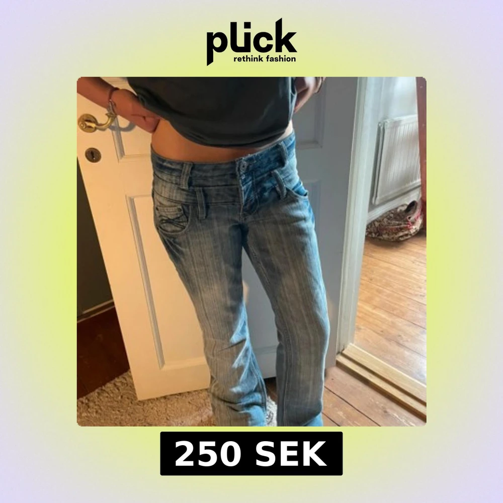 Säljer ett par lågmidjade bootcut jeans i ljusblå tvätt med snygga slitningar och dekorativa sömmar på bakfickorna. Jeansen har klassisk femficksdesign, bälteshällor och dragkedjegylf. Perfekta för dig som gillar en avslappnad och trendig look, säljer för att dem var för små för mig💕