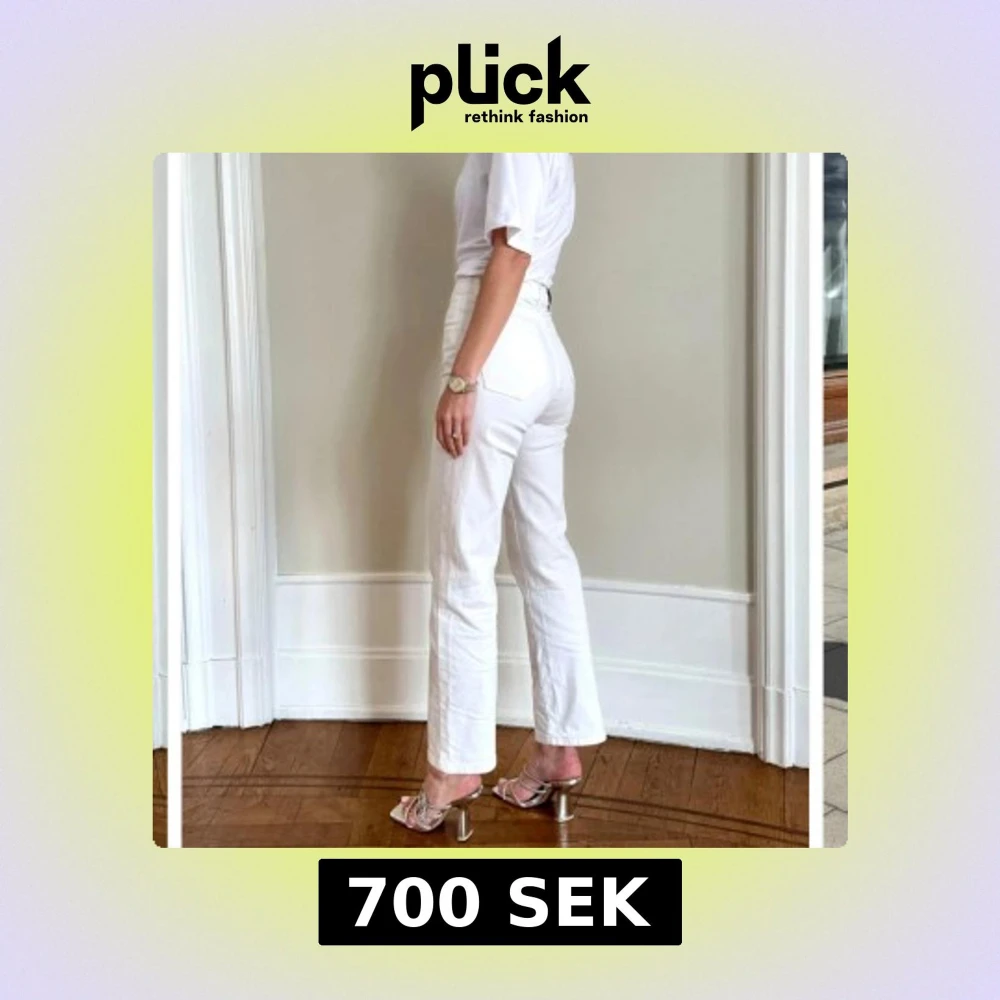 Snygga vita jeans från Sanne Alexandra med raka ben i modellen cropped stretch jeans. Klassisk femficksmodell med stilren design och läderpatch bak i midjan. Endast använda ett par timmar då jag köpte två storlekar och valde den andra. Storlek 38. Nypris är 995 kr.