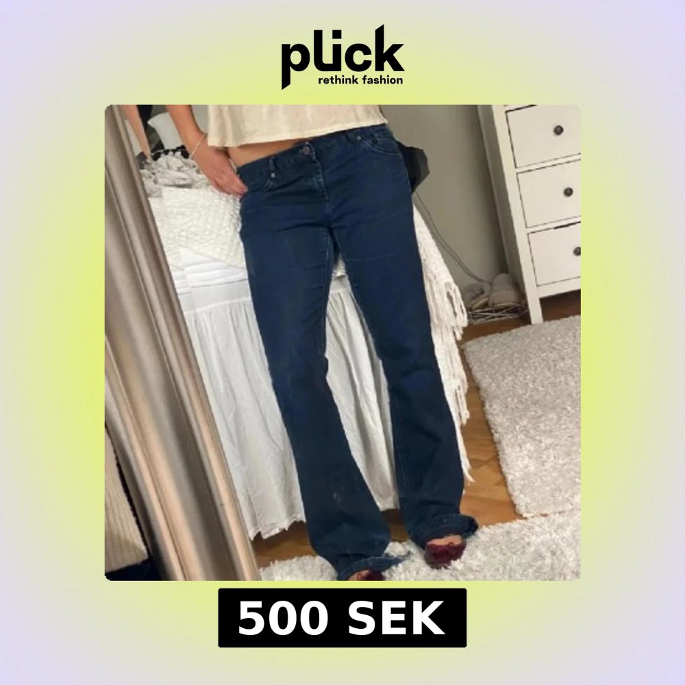 Snygga mörkblå bootcut jeans med låg midja. Älskade verkligen de här men tyvärr var de för stora så bilderna är därav från förra ägaren😝