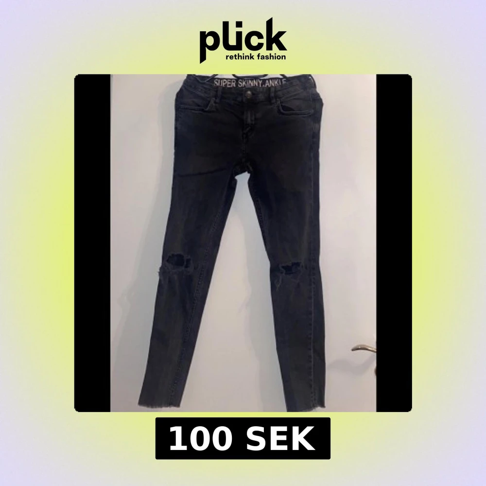 Snygga svarta super skinny jeans med slitna knän. Perfekta för en trendig look. De har en knapp och dragkedja framtill samt klassiska fem fickor.