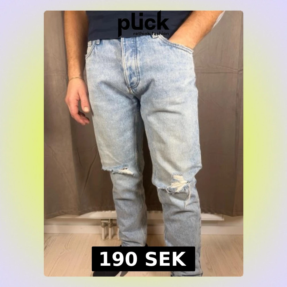 Säljer ett par ljusblå jeans från FSBN Denim med slitna detaljer och hål på båda knäna. Jeansen har en rak passform och klassisk femficksdesign. Materialet är jeans i bomull och de har en schysst vintage tvätt. Perfekta för dig som gillar en avslappnad och trendig stil.