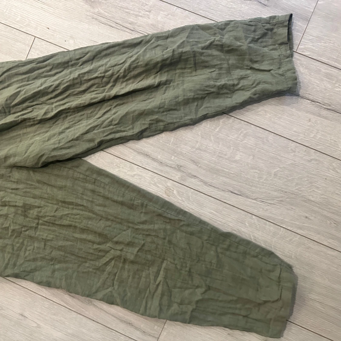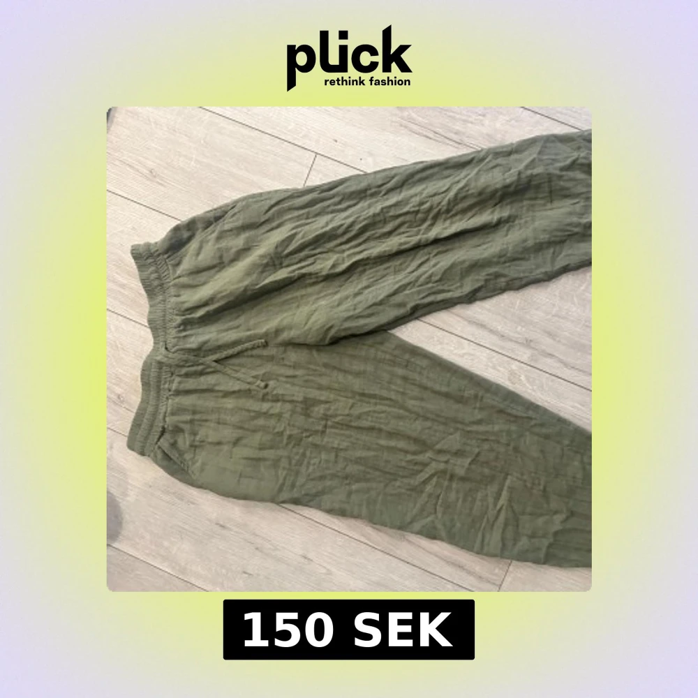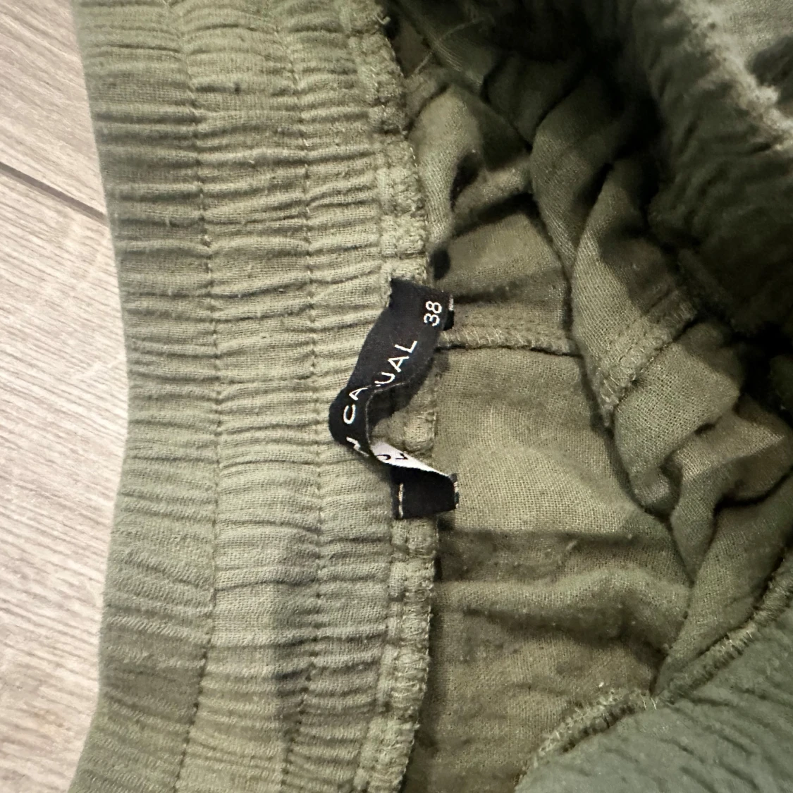 Säljer ett par olivgröna linnebyxor från Casual i storlek 38. Byxorna har resår och snörning i midjan för skön passform och är tillverkade i ett lätt och luftigt linnematerial. Perfekta för chill dagar eller när du vill ha en avslappnad stil. Behövs bara strykas, Annars fint skick:)