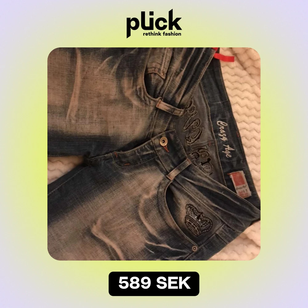 Säljer ett par blå jeans från Crazy Age med coola broderade kronor på bakfickorna. Jeansen har en bootcut-stil och är dock lite slitna på nedredelen av byxorna❤️ mått - midja: 35cm innebenslängd: 86cm