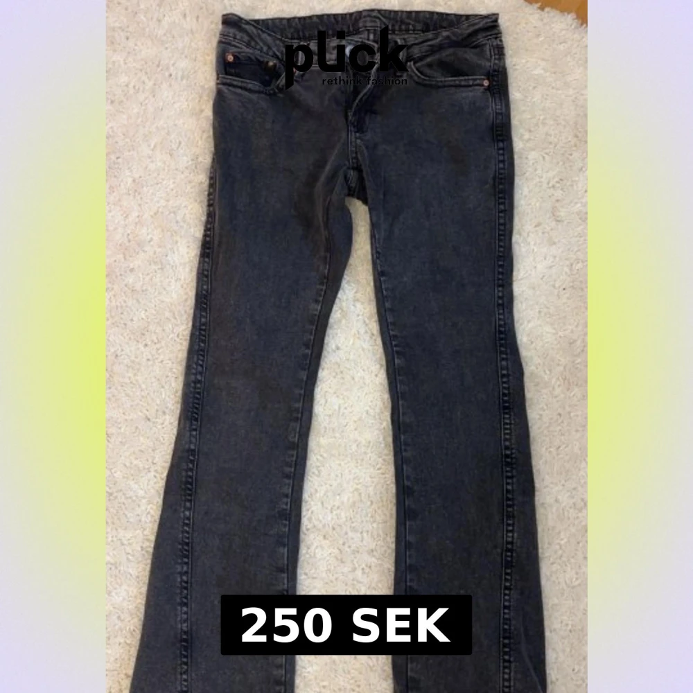 Säljer mina mörkgråa ginatricot bootcut jeans med fina mönster på bakfickorna. Jeansen är lågmidjade och storlek 38💘