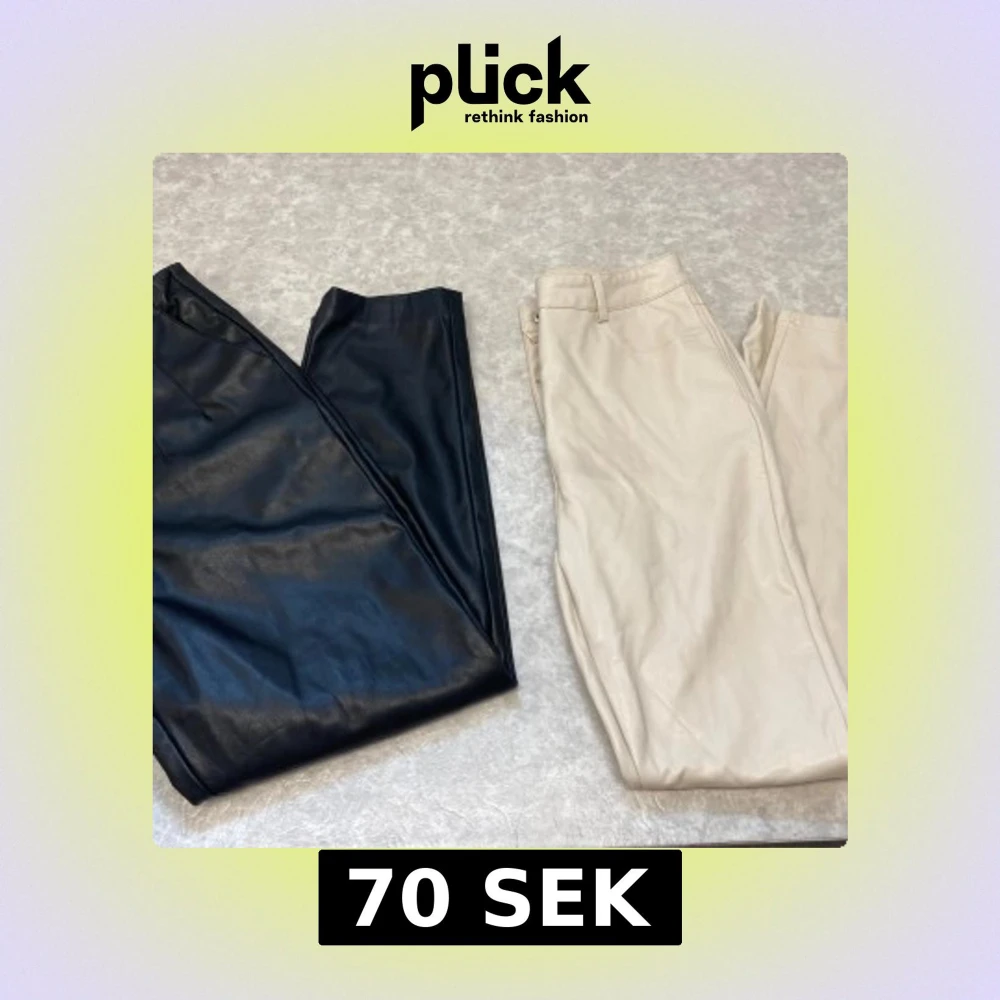 Två par snygga byxor i skinnimitation, ett par svarta från AMISU i storlek 38 och ett par beigea från FB Sister i storlek S. Båda har klassisk passform med dragkedja och knapp, perfekta för en trendig look.
