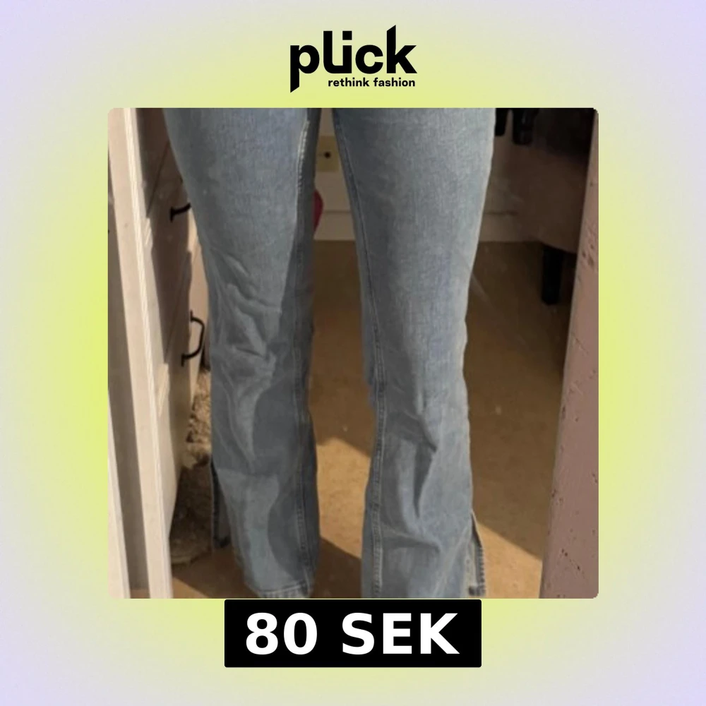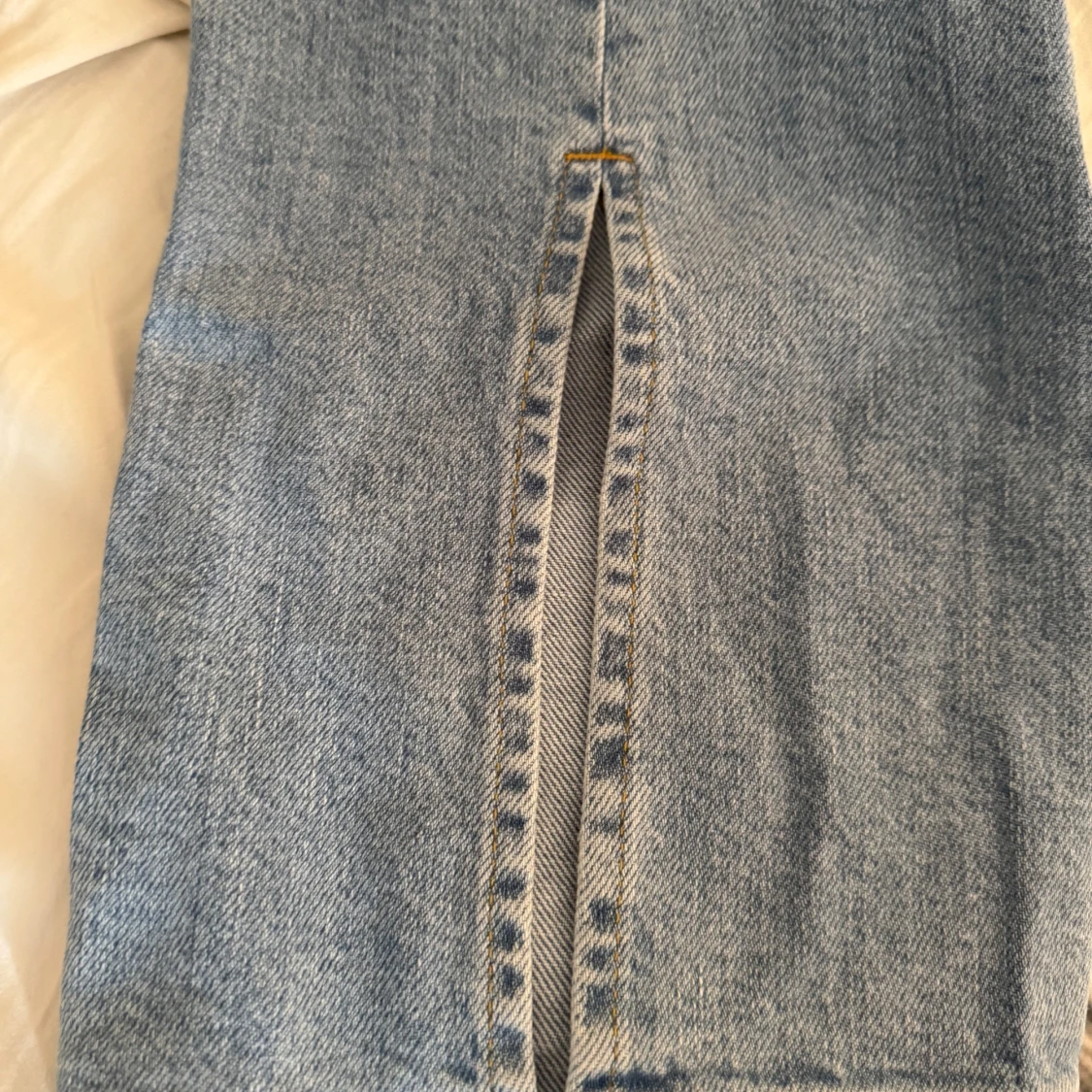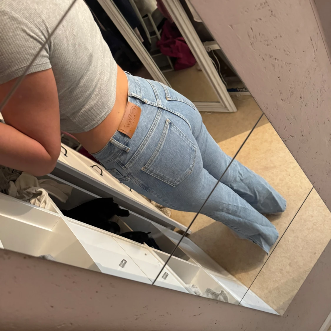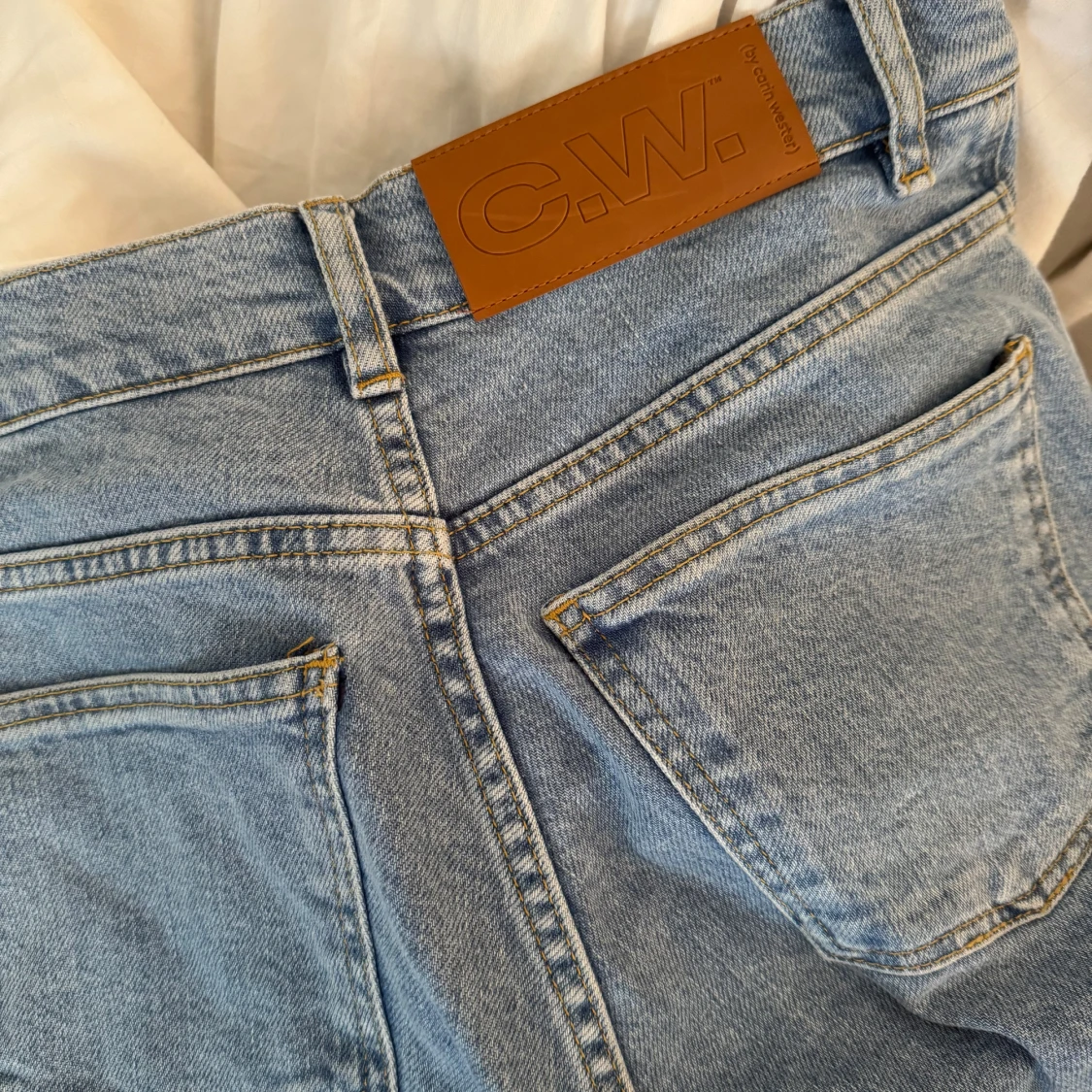 Säljer ett par ljusblå jeans från C.W. i modellen Hazel. De har hög midja, raka ben och en snygg slits längst ner på benen. Jeansen är tillverkade i stretchigt denim med 99% bomull och 1% elastan. Klassisk femficksdesign och läderpatch bak.