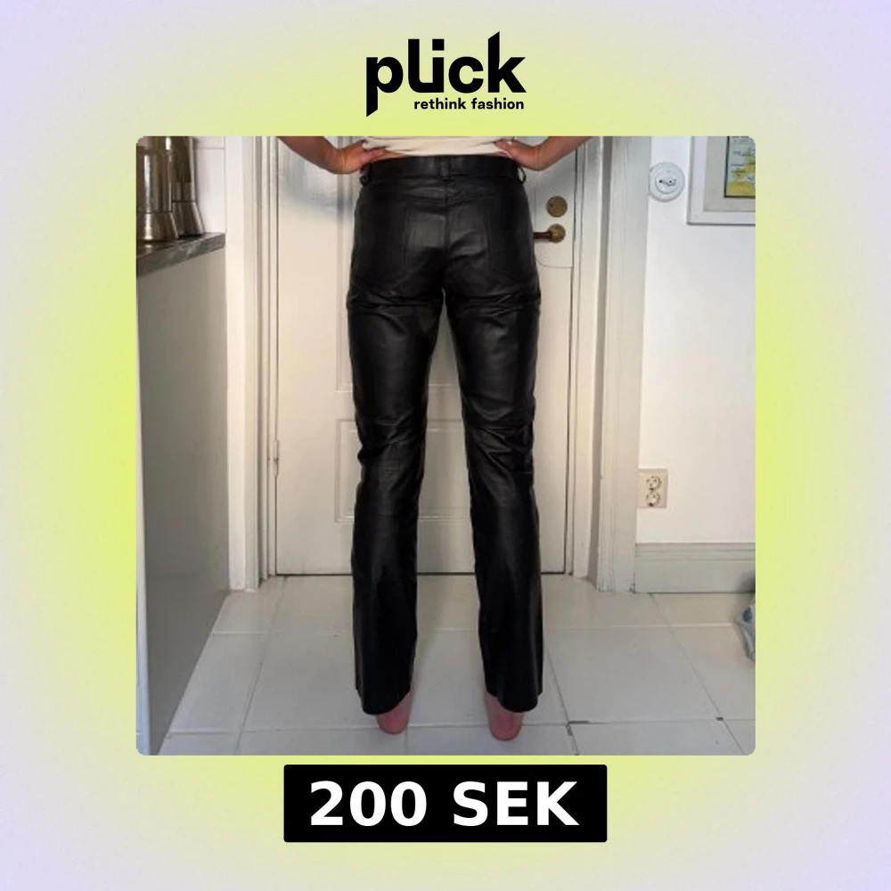 Säljer ett par svarta skinnbyxor med låg midja och raka ben. Byxorna har bälteshällor, knapp och dragkedja framtill. Snygg passform och stilren look som passar till allt. Perfekta för dig som vill ha en edgy vibe. Midjans omkrets: 84cm. Vintage utan märke därav ingen exakt storlek. Jag på bilden är 176cm. Hör av dig för fler mått och bilder!