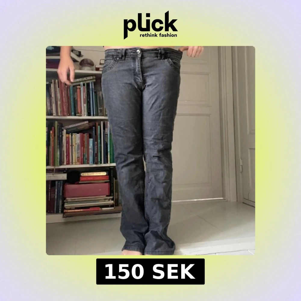 Säljer ett par grå jeans med bootcut-passform och snyggt rosa broderi med texten 'Bootcut' på insidan av linningen. Jeansen har klassiska fem fickor och coola svarta detaljer på bakfickorna. Materialet är jeans och färgen är mörkgrå.