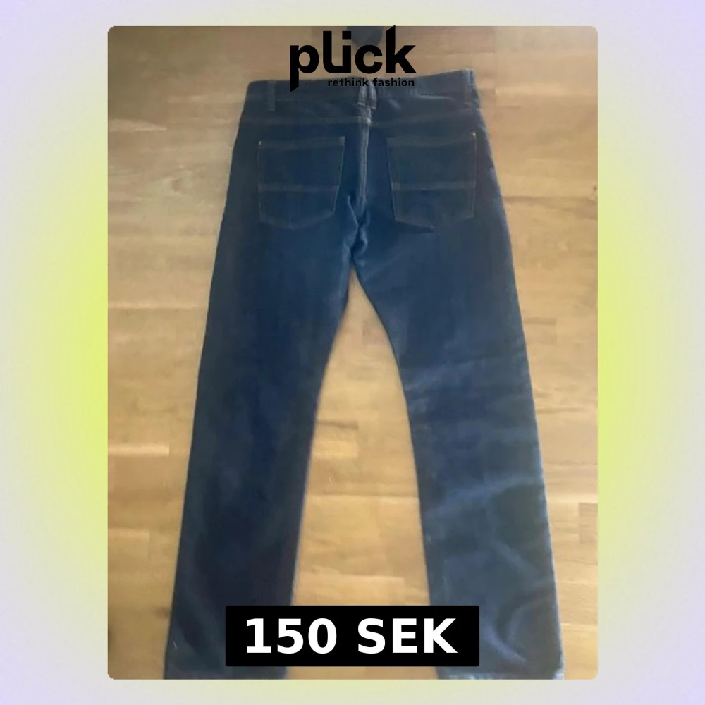 Säljer ett par mörkblå jeans med klassisk femficksdesign och raka ben. Jeansen har normal passform och är tillverkade i ett robust denimtyg. Perfekta för dig som gillar en enkel och tidlös look.