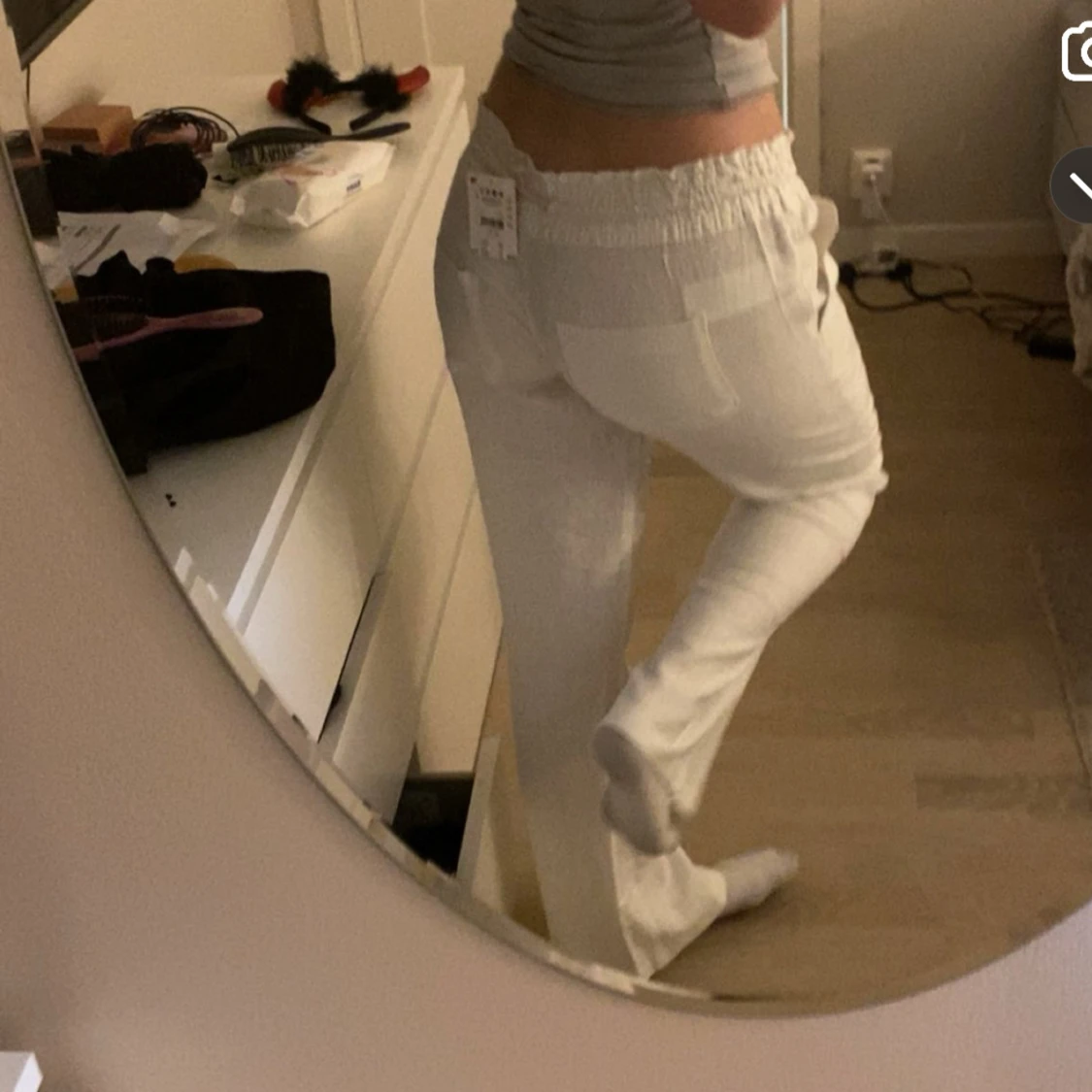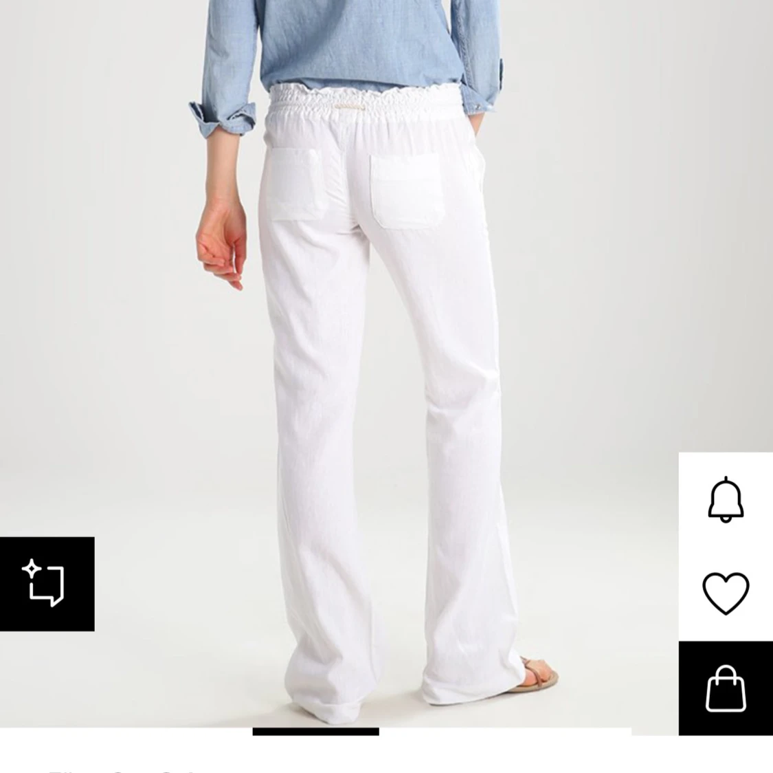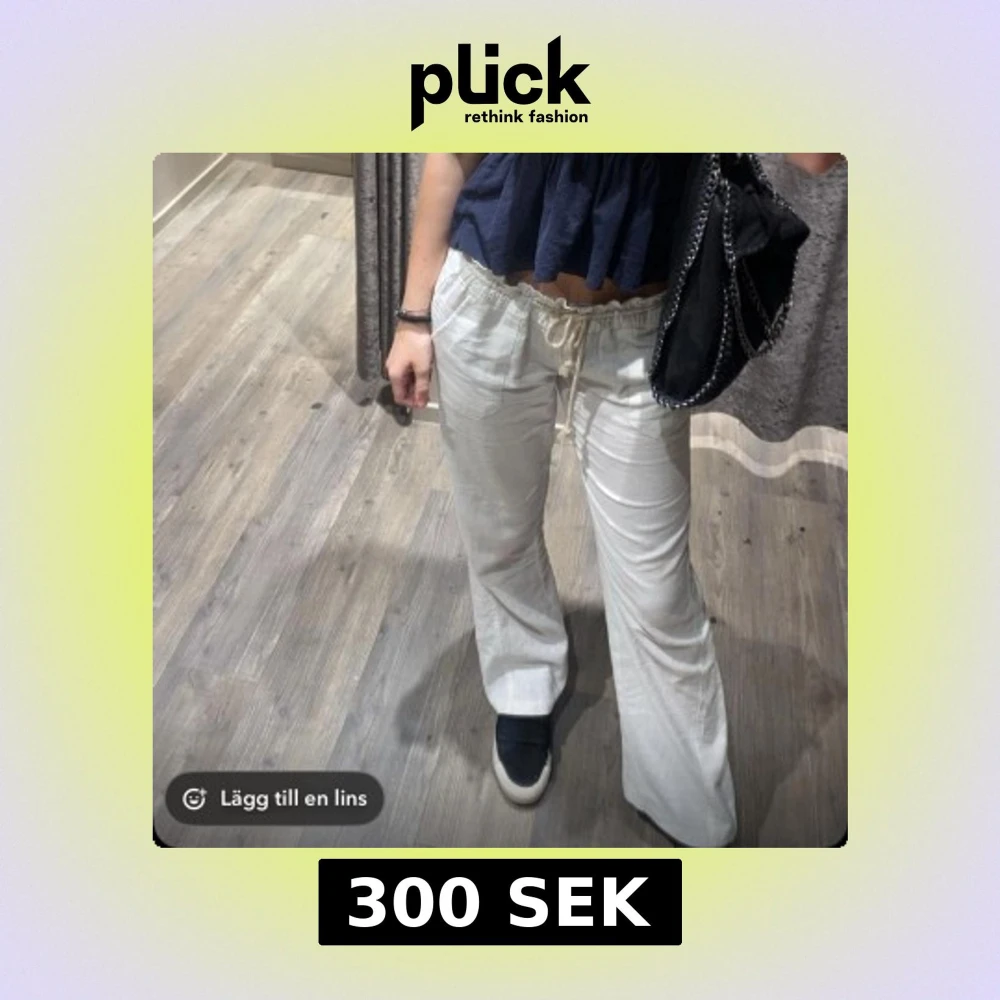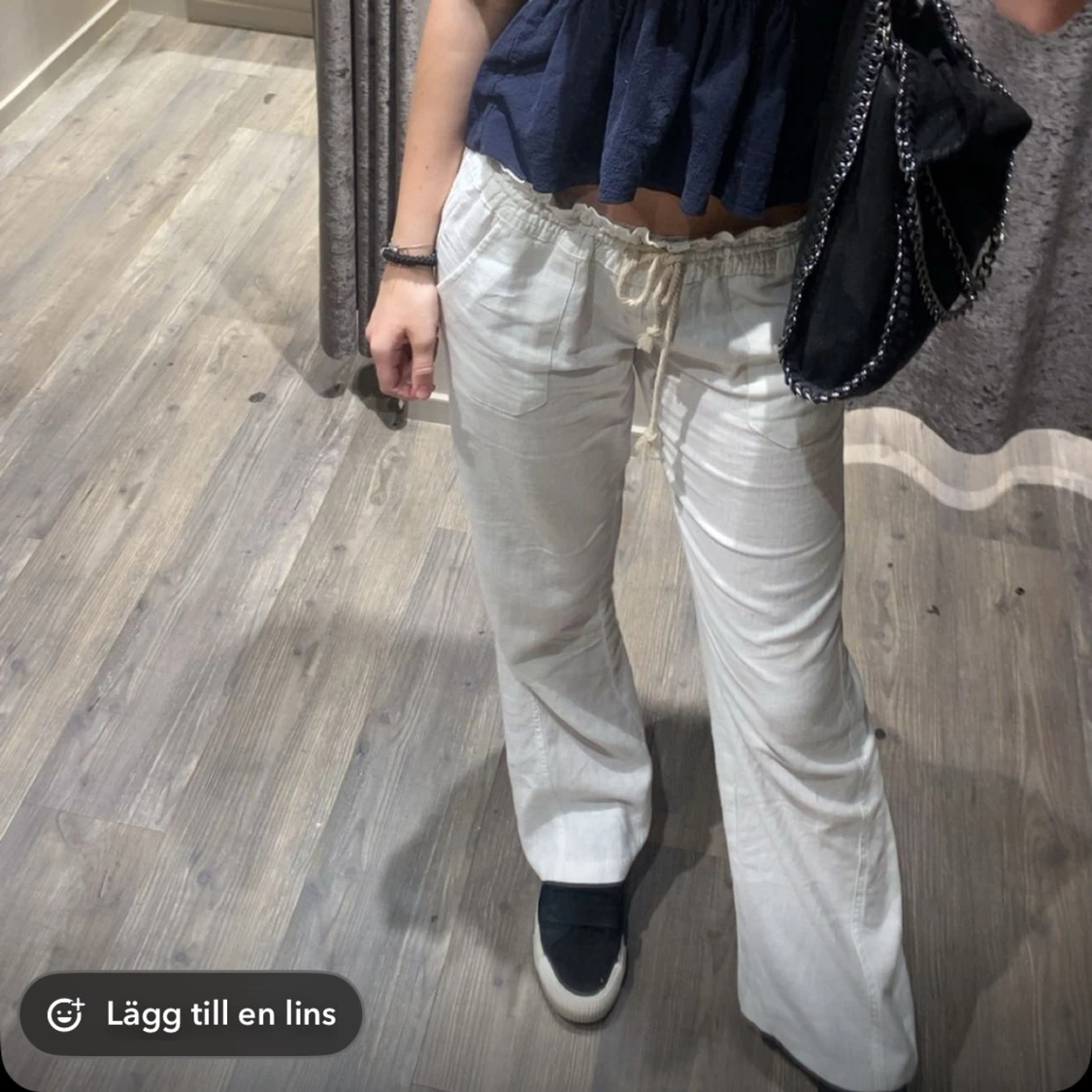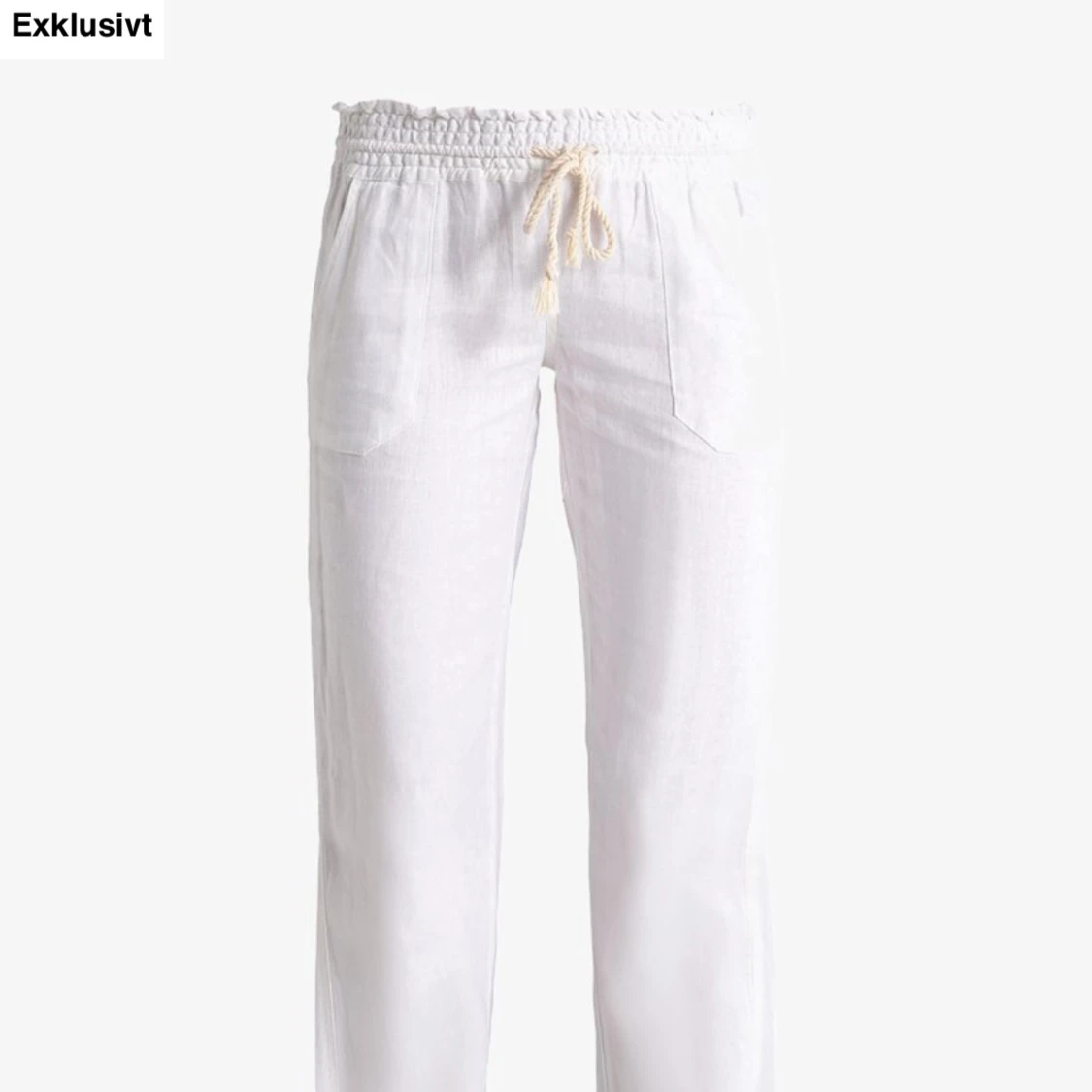 Säljer ett par vita linnebyxor med resår och dragsko i midjan. Byxorna har raka ben, sidfickor och är tillverkade i ett lätt och luftigt linnematerial. Perfekta för varma dagar och enkel att matcha med olika toppar.