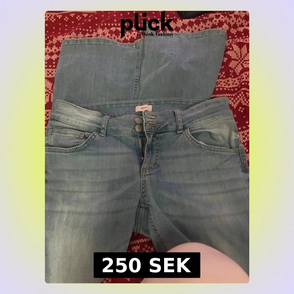 Säljer ett par blåa jeans ifrån Nelly. Säljer då de inte kommer till användning längre. De har en liten skada vid foten som man kan se på bild 7. De är i storlek 40 men passar mig som har 38-40 i vanliga fall. Nypris: 699kr PRIS KAN DISKUTERAS!!