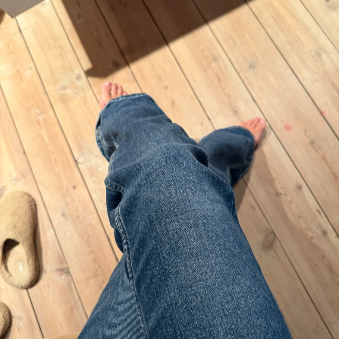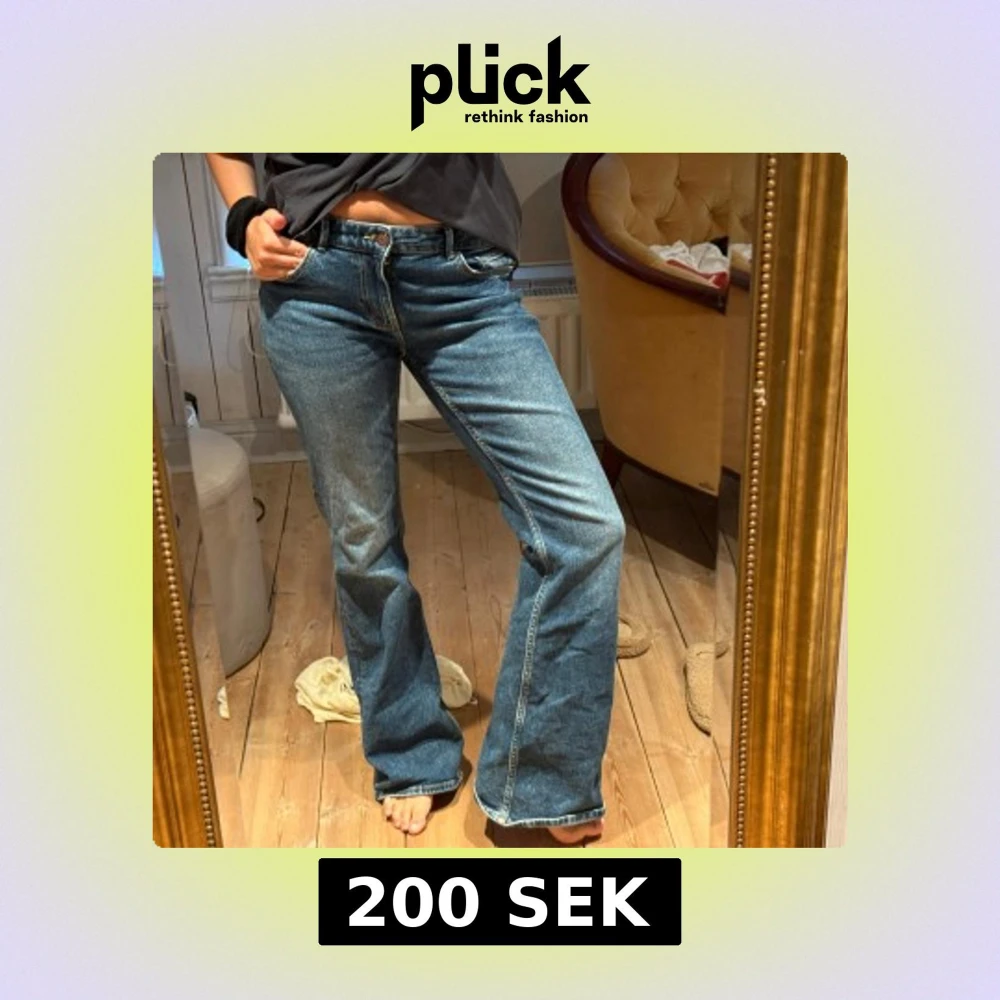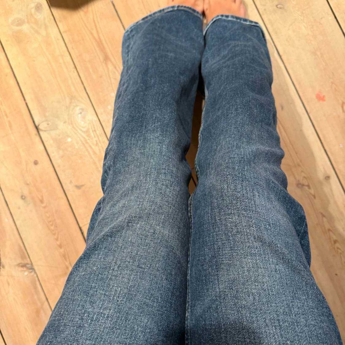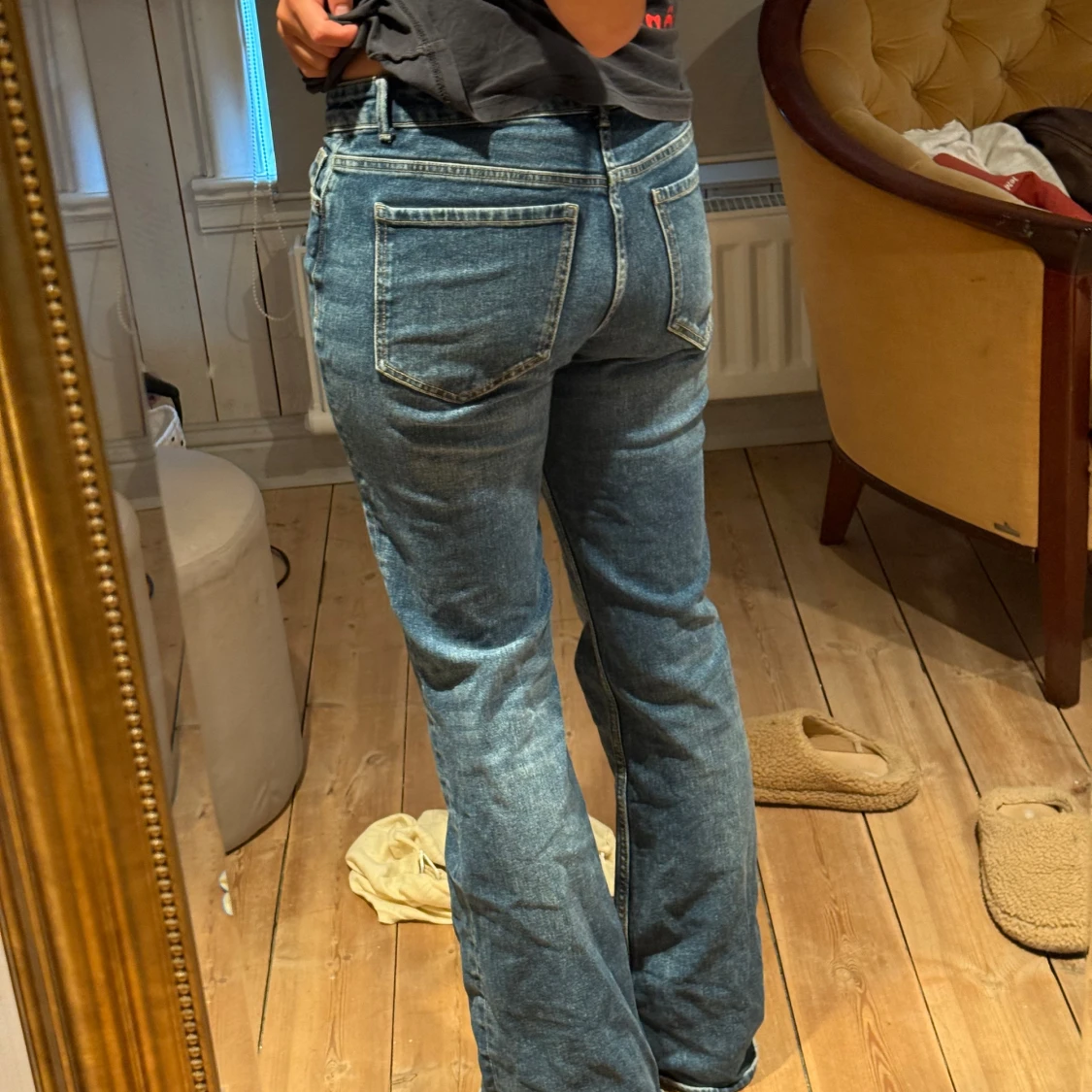 Säljer ett par klassiska blå jeans med bootcut passform och låg midja. Jeansen har fem fickor, dragkedja och knapp framtill. Materialet är robust denim som ger en snygg vintagekänsla. Perfekta för dig som gillar en avslappnad men trendig look. Storlek 40 men sitter kanske bäst på S-M