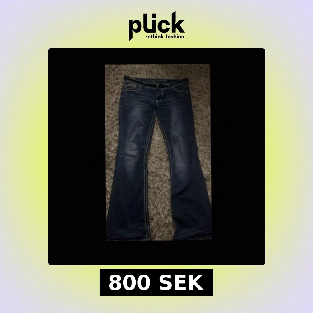 Snygga mörkblå jeans från Vanity med bootcut passform och markerade kontrastsömmar. Bakfickorna är dekorerade med broderier och nitar som ger extra edge. Jeansen har klassisk femficksdesign och dragkedja framtill. Köpte de i usa för 100$ pris går altid att diskutera