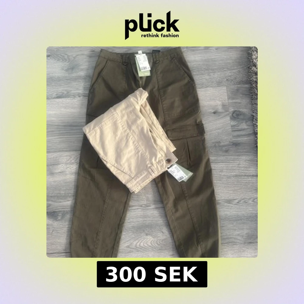 Två par cargopants, ett i beige och ett i olivgrönt. Båda har flera fickor på sidorna och raka ben. Perfekta för en avslappnad och trendig stil.
