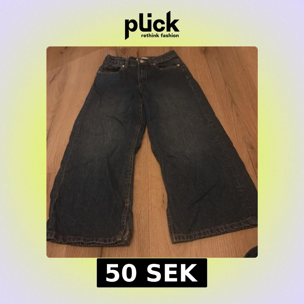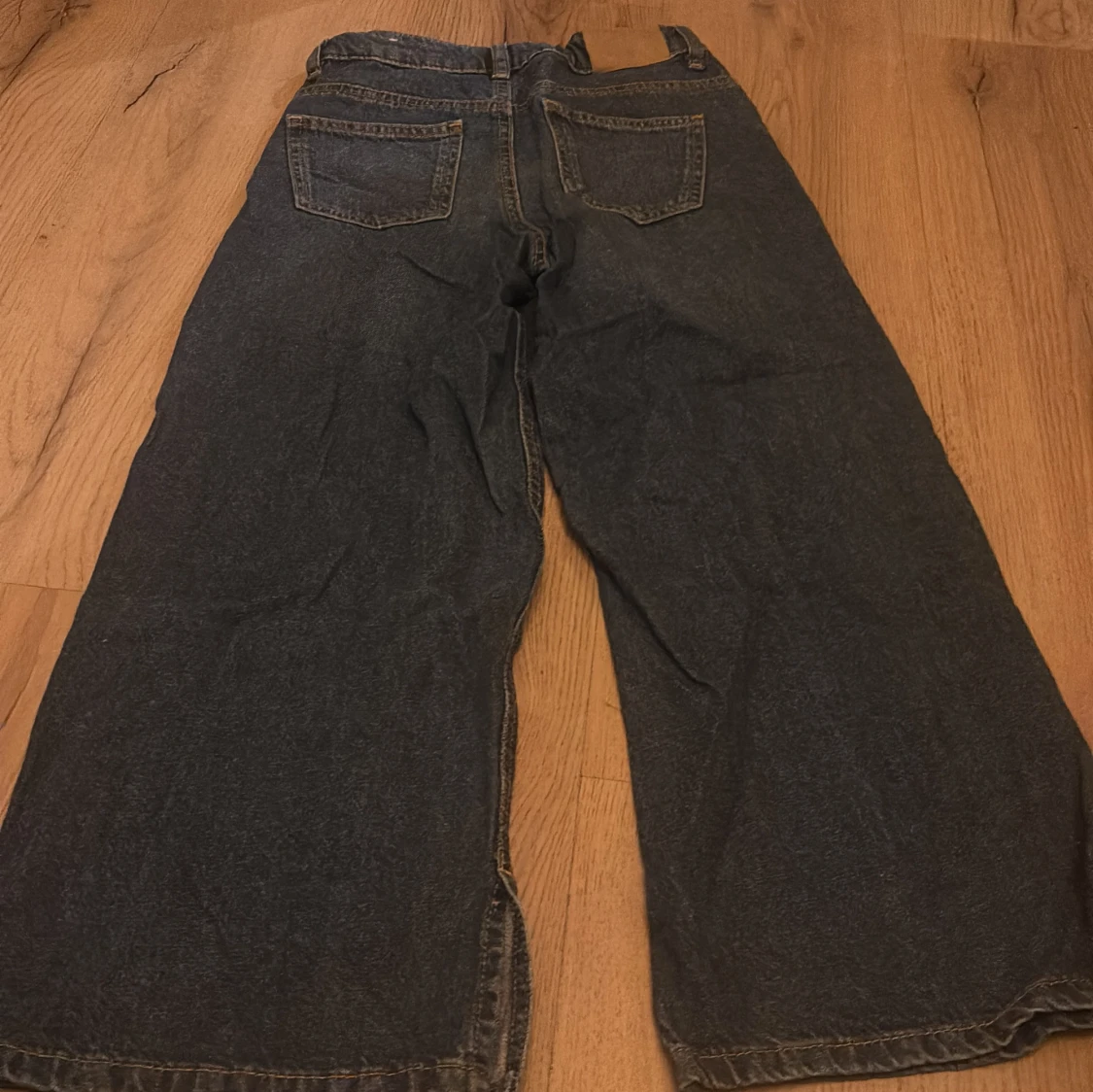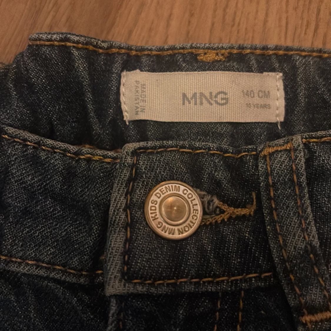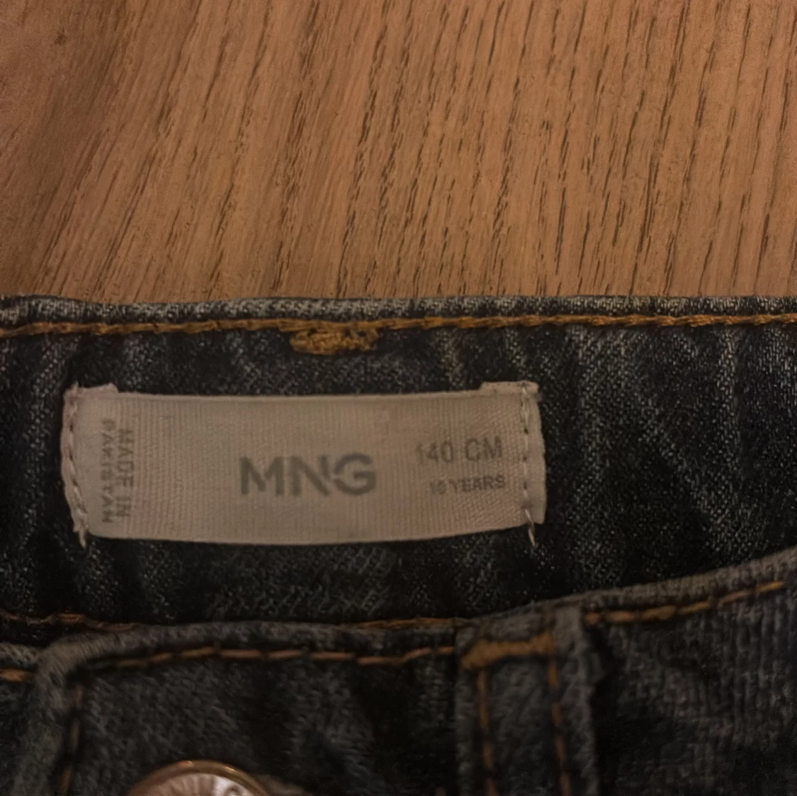 Säljer ett par mörkblå jeansbyxor från MNG. Byxorna har en klassisk femficksdesign och är tillverkade i denim. Perfekta för en avslappnad stil med en bred passform.