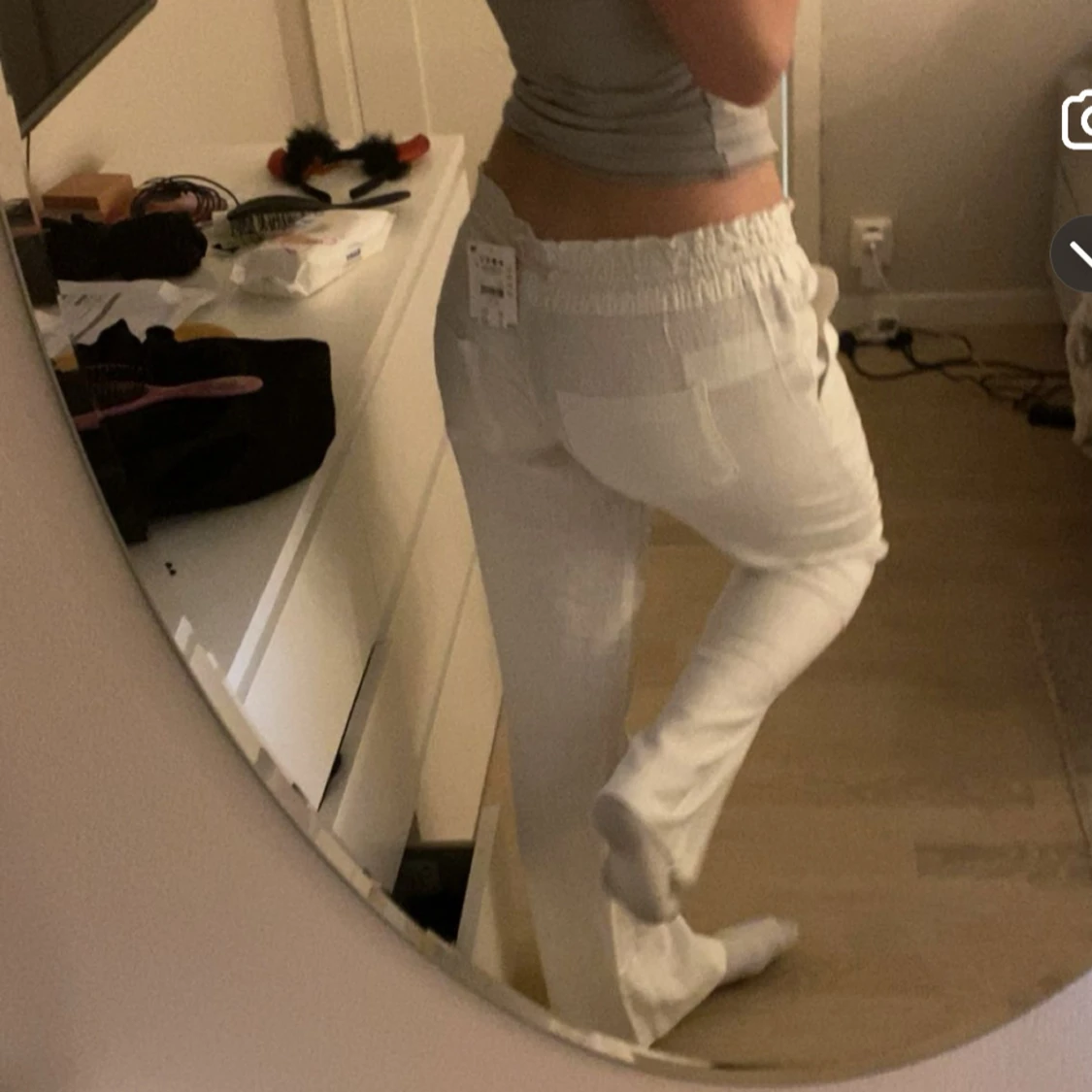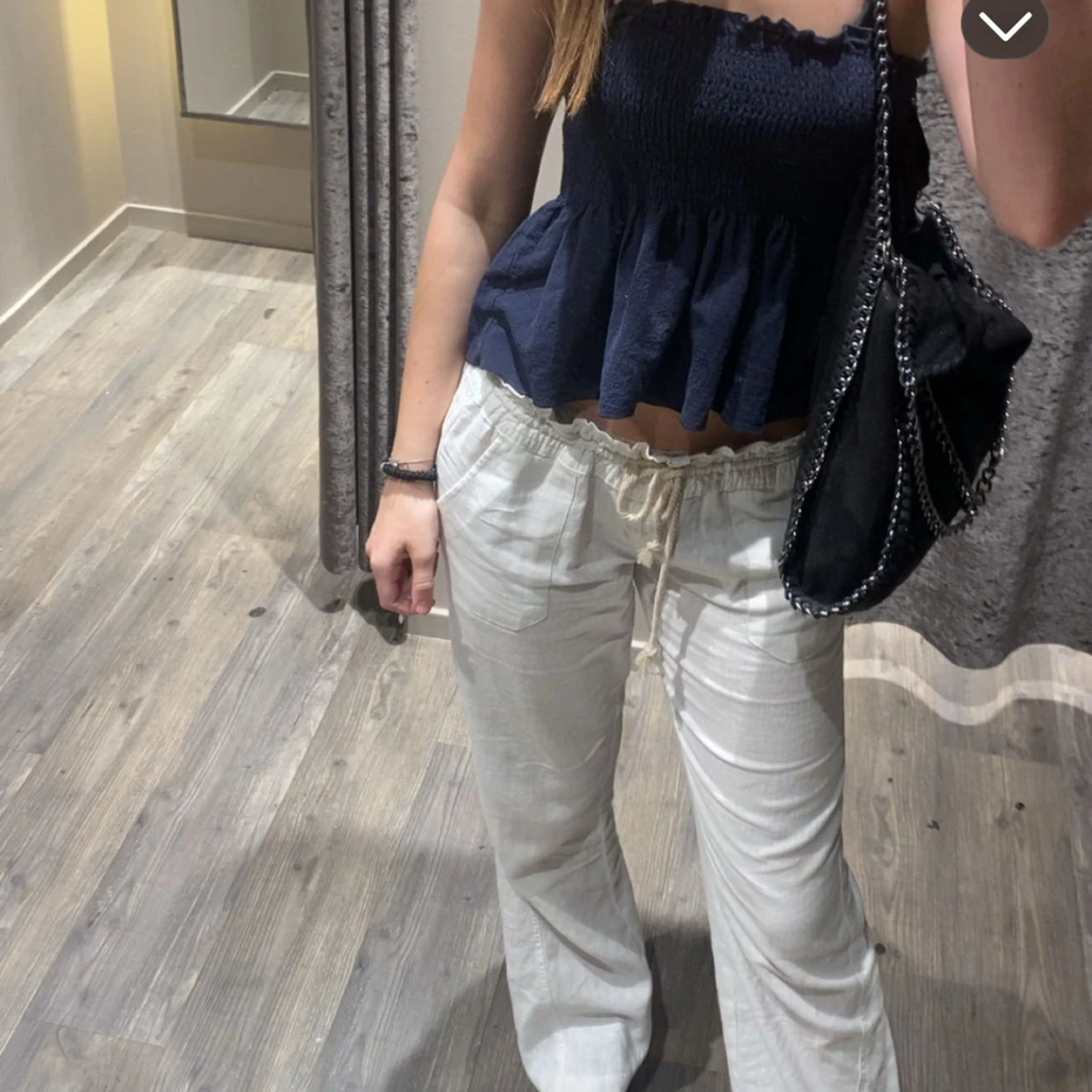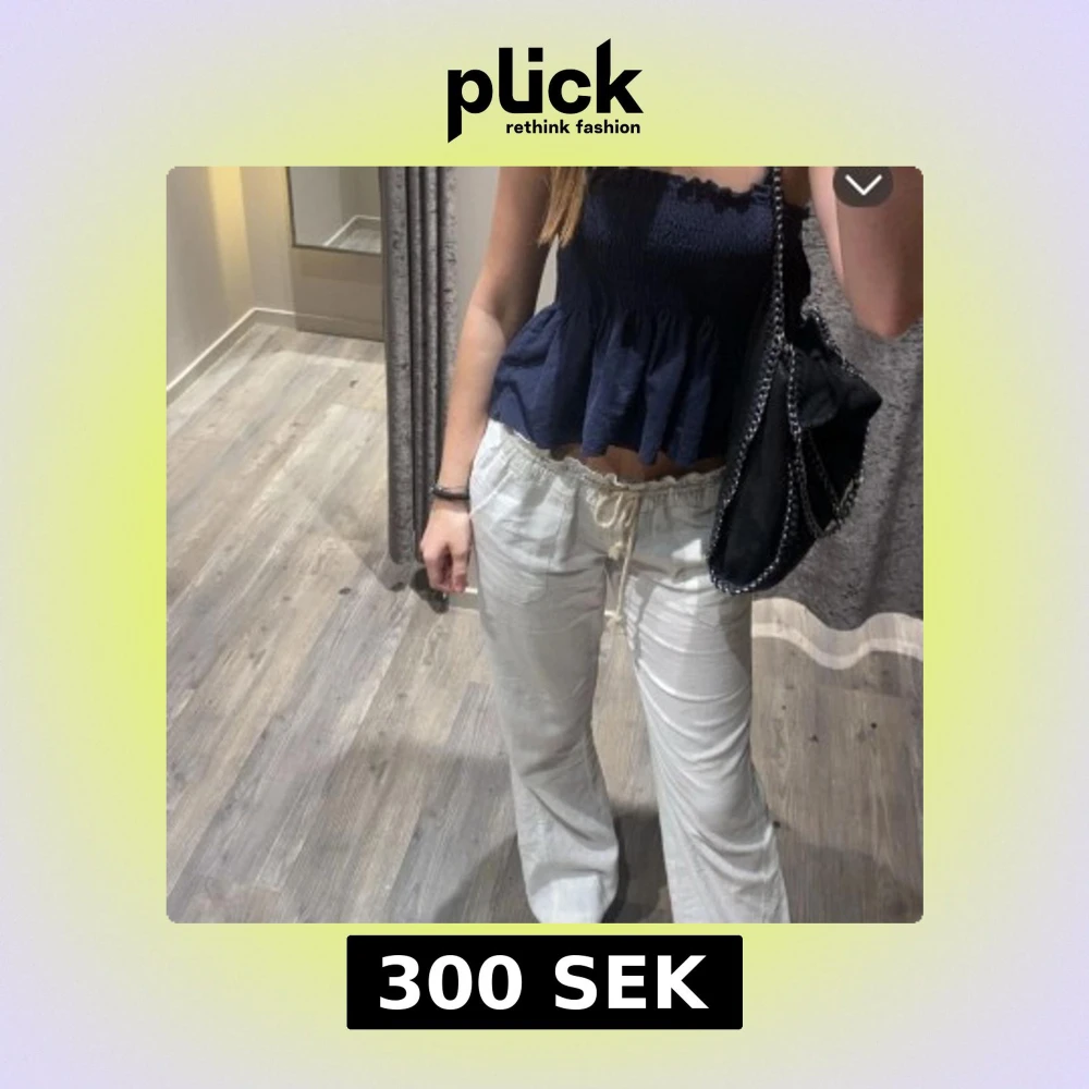 Säljer ett par vita linnebyxor med avslappnad passform och dragsko i midjan. Byxorna har raka ben, resår i midjan och fickor både fram och bak. Perfekta för varma dagar och enkel att styla med olika toppar.