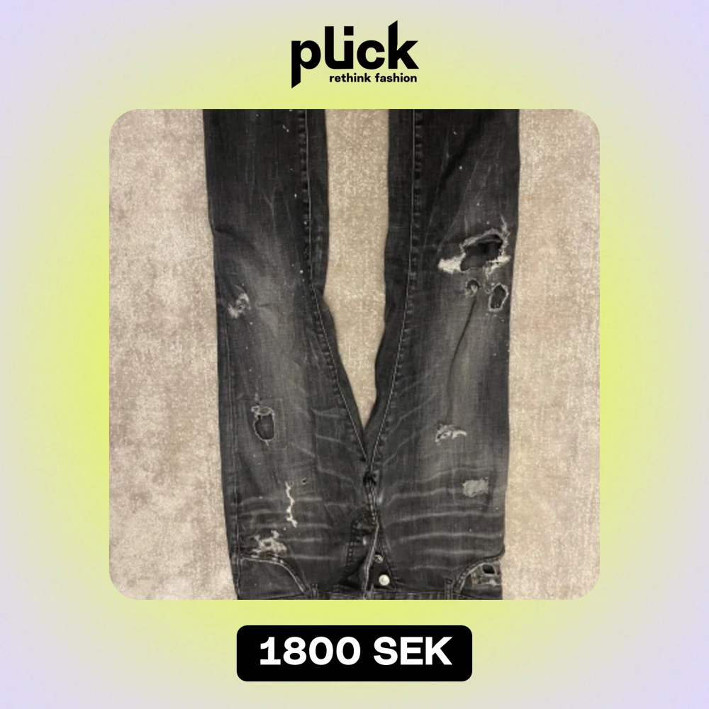 Säljer ett par svarta jeans från Dsquared2 med en cool distressed look. De har flera slitningar och hål för en edgy stil. köpta på NK för 7500kr inget kvitto tyvärr. Perfekta för en avslappnad och trendig outfit! Äkta såklart!