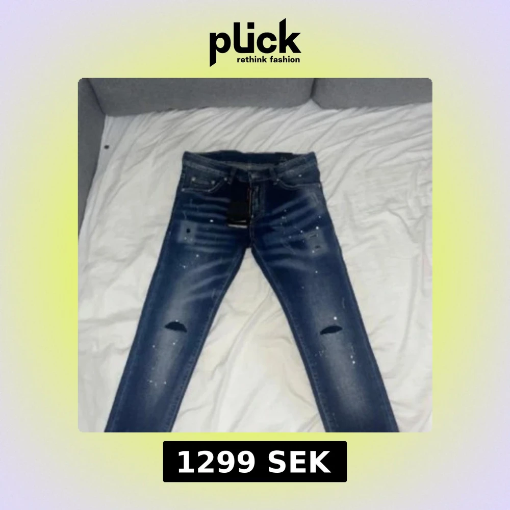 Säljer ett par blå jeansbyxor från Dsquared2 med slitningar, hål på knäna och vita färgstänk. Klassisk femficksmodell med normal passform och snygga detaljer. Märkeslapp bak i midjan. Perfekta för en trendig streetstil.