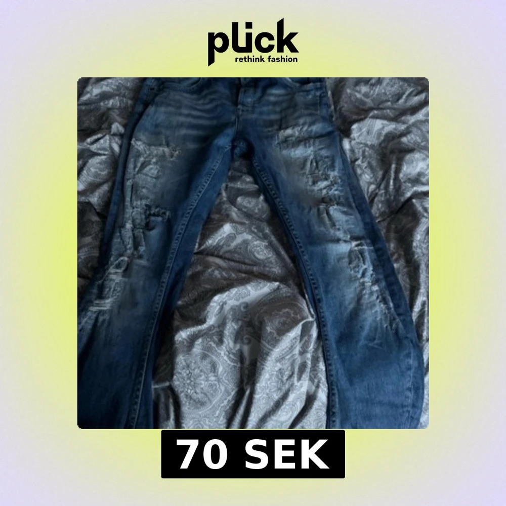 Säljer ett par blå jeans med flera slitningar och trasiga detaljer på både fram- och baksida. Jeansen har klassisk femficksmodell och normal passform. Perfekta för en avslappnad och trendig look.