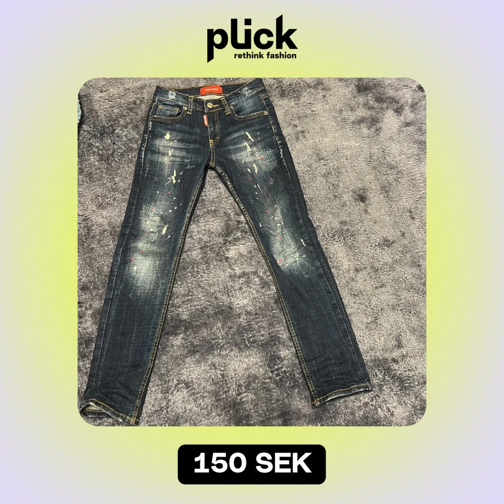 Säljer ett par snygga mörkblå jeans från Dsquared2 med coola färgstänk och slitningar. De har en slim passform och är perfekta för en trendig look. Jeansen har en klassisk femficksdesign och en röd logga på baksidan. Perfekta för både vardag och fest!