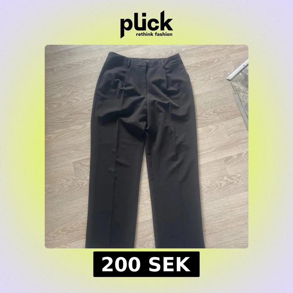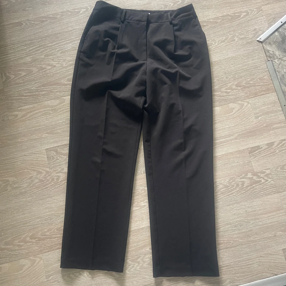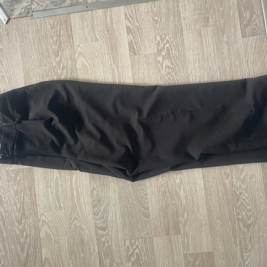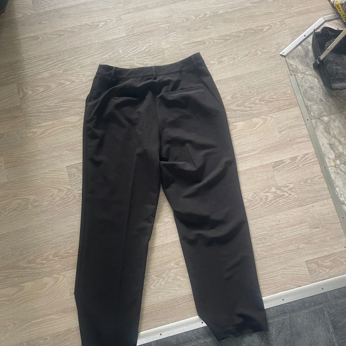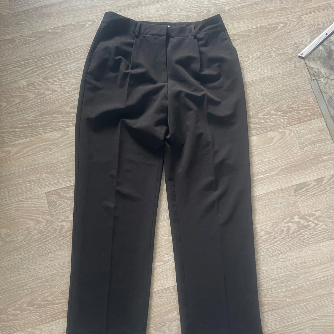 Snygga svarta kostymbyxor med klassiska pressveck och rak passform. Byxorna har hällor för bälte och diskreta fickor bak. Har andvänts fåtal gånger och är i mycket bra skick