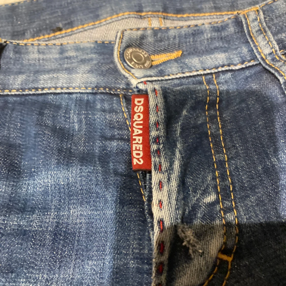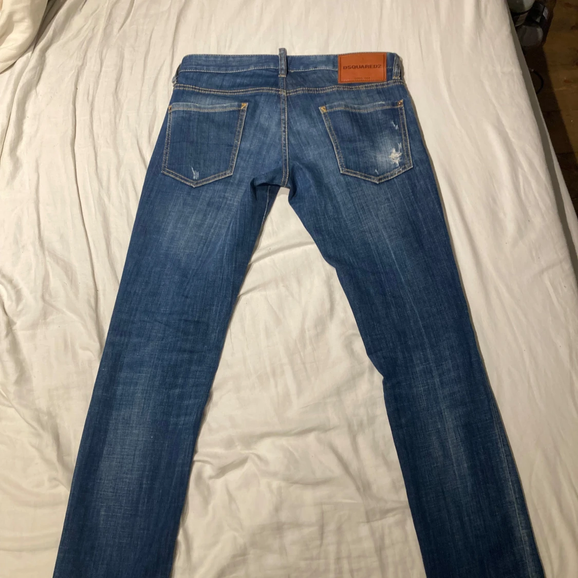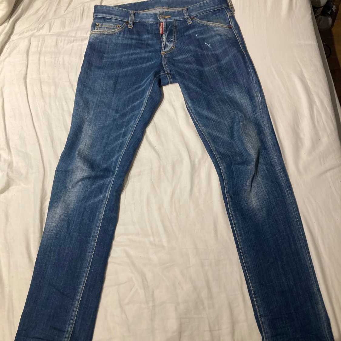Snygga blå jeans från DSQUARED2 med klassisk femficksdesign och knappgylf. Jeansen har en diskret slitning och märkets logga synlig vid gylfen. Perfekta för en stilren look.