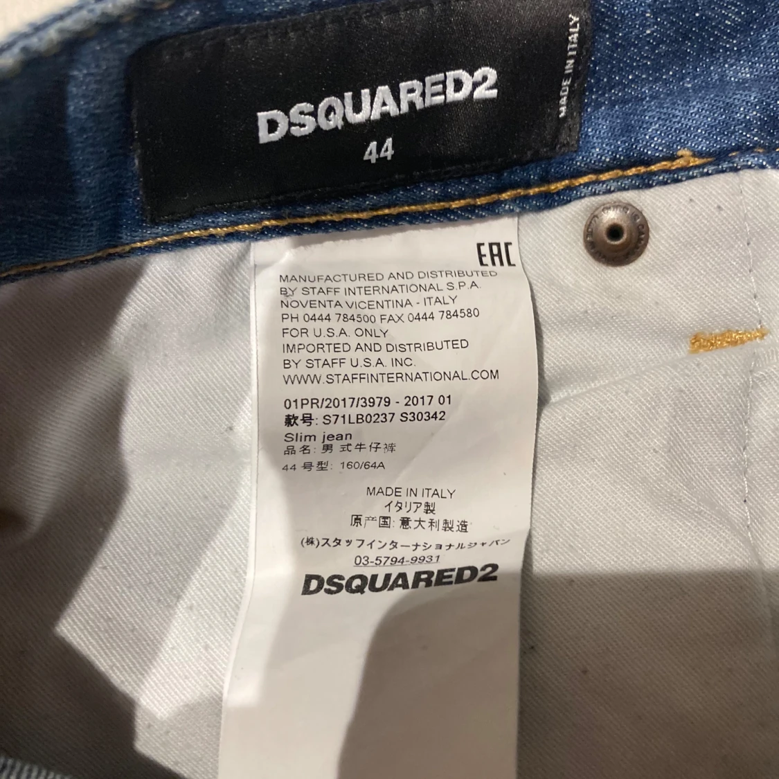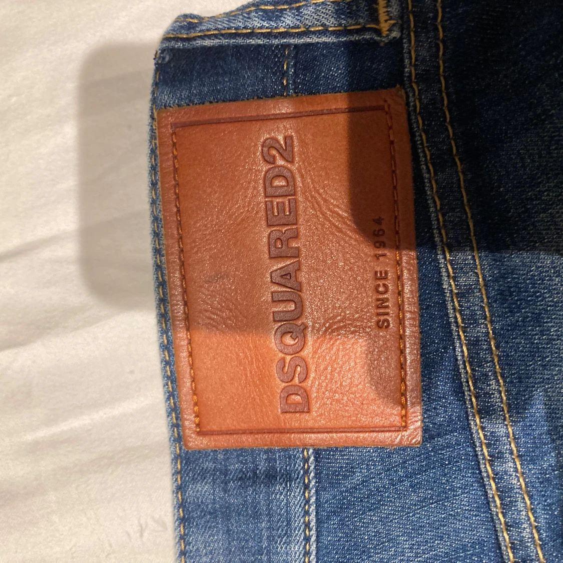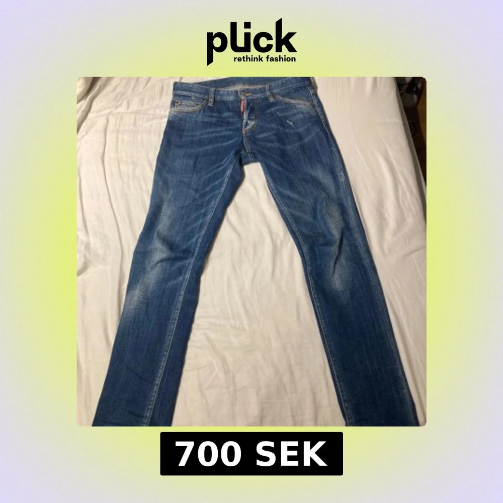 Snygga blå jeans från DSQUARED2 med klassisk femficksdesign och knappgylf. Jeansen har en diskret slitning och märkets logga synlig vid gylfen. Perfekta för en stilren look.