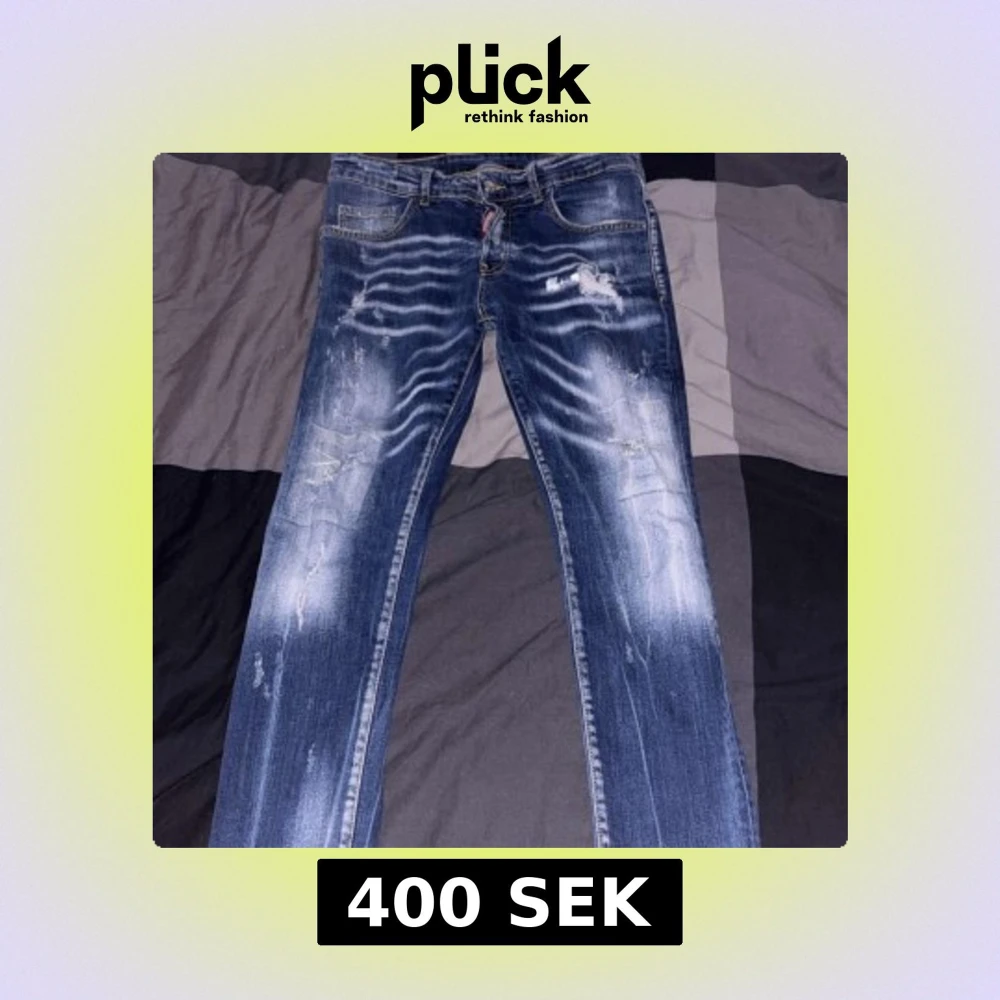 Säljer ett par blå jeans från dsquared2. Klassisk femficksmodell med gylf och knapp, samt Dsquared2-logga vid fickan. Snygga kontrastsömmar och rak passform.