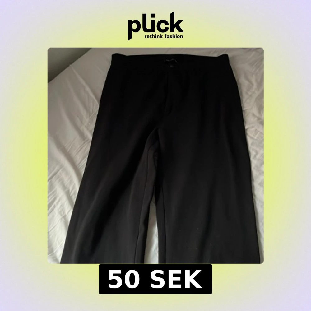 Säljer ett par svarta byxor med vid passform och hög midja. Byxorna har en enkel och stilren design utan synliga detaljer eller mönster. Perfekta för dig som gillar en klassisk och avslappnad look.