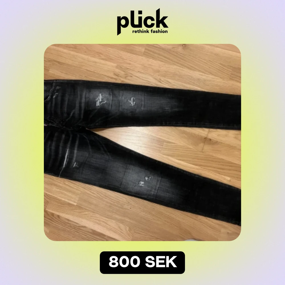 Säljer ett par svarta jeans från Dsquared2 i storlek 44. De är snyggt slitna med flera hål och slitningar på både fram- och baksidan. Perfekta för en cool och avslappnad stil. De är i bra skick och redo för en ny ägare!