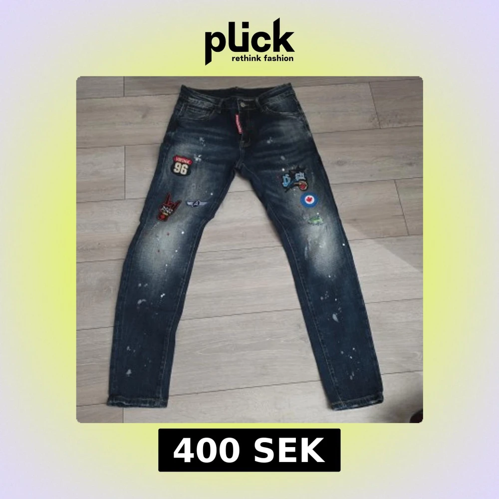 Unika mörkblå jeans med coola patches och färgstänk framtill. Jeansen har klassisk femficksmodell, smal passform och slitna detaljer. Flera broderade märken och tryck ger en streetig vibe. Perfekta för dig som vill sticka ut med din stil.