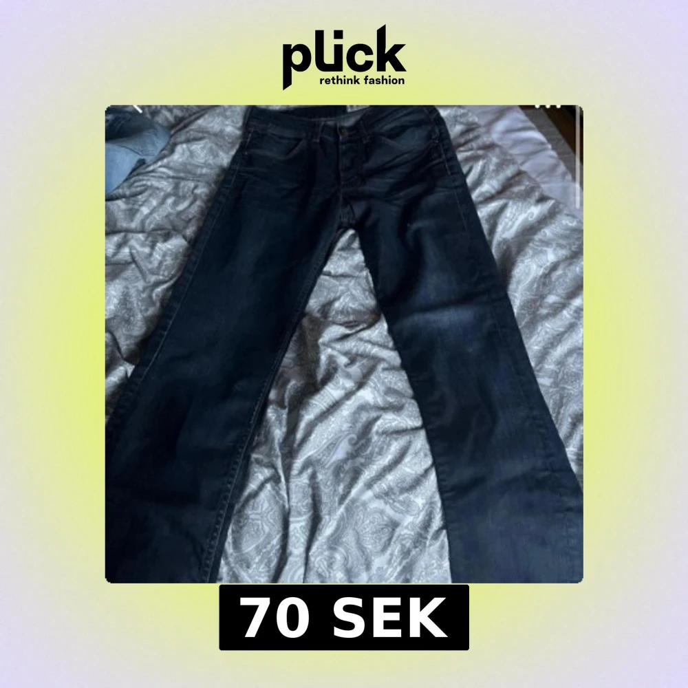 Säljer ett par svarta jeansbyxor med klassisk femficksdesign och raka ben. Byxorna har normal passform och är perfekta för en stilren look. Inga synliga detaljer som slits eller broderier, bara en enkel och tidlös design.