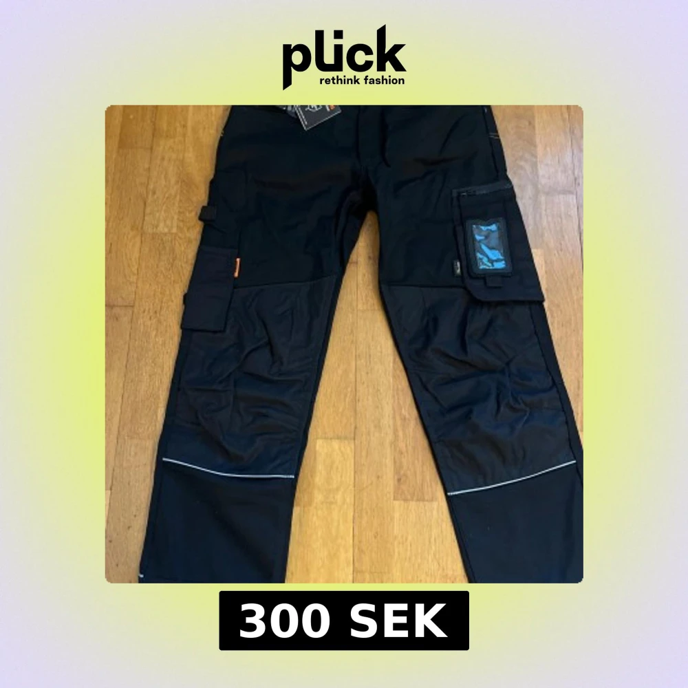 Svarta arbetsbyxor från Jobman med flera praktiska fickor, bland annat benficka med plastfönster för ID-kort. Byxorna har förstärkta knän och reflexdetaljer vid bensluten. Perfekta för dig som behöver tåliga byxor med smarta funktioner. Helt nya