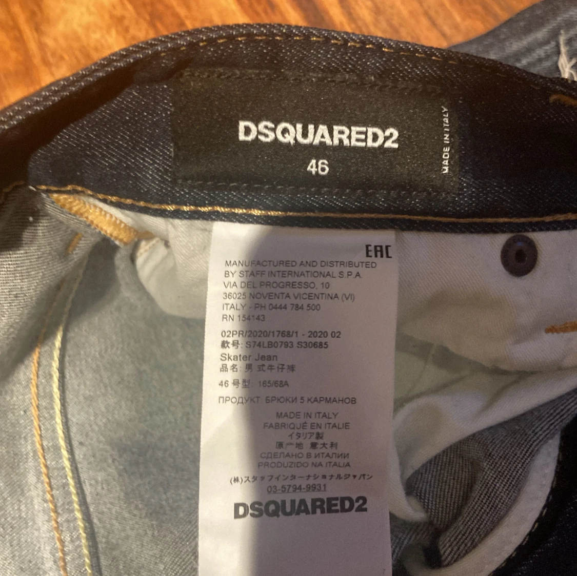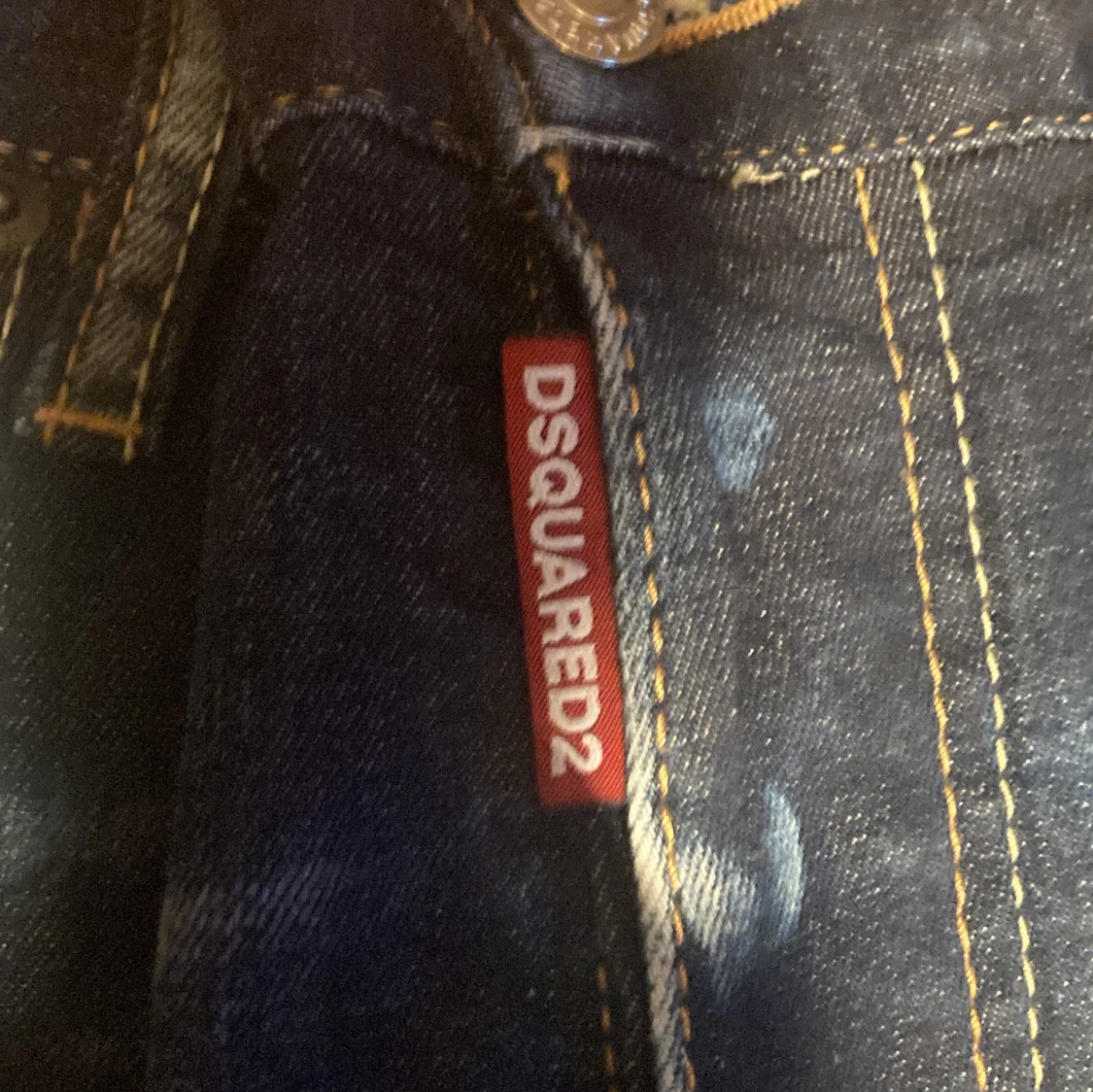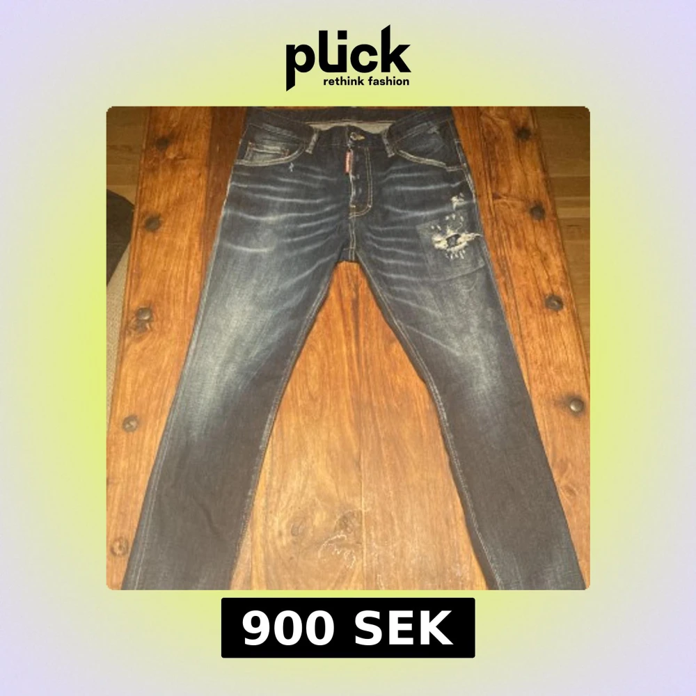 Säljer ett par mörkblå jeans från Dsquared2 med slitningar och detaljerade sömmar. Jeansen har klassisk femficksdesign, gylf med dragkedja och Dsquared2-logga på etiketten. Snygg tvätt och slim passform. Självklart äkta orderbekräftelsen finns! Helt perfekt i skicket inget fel på dem alla