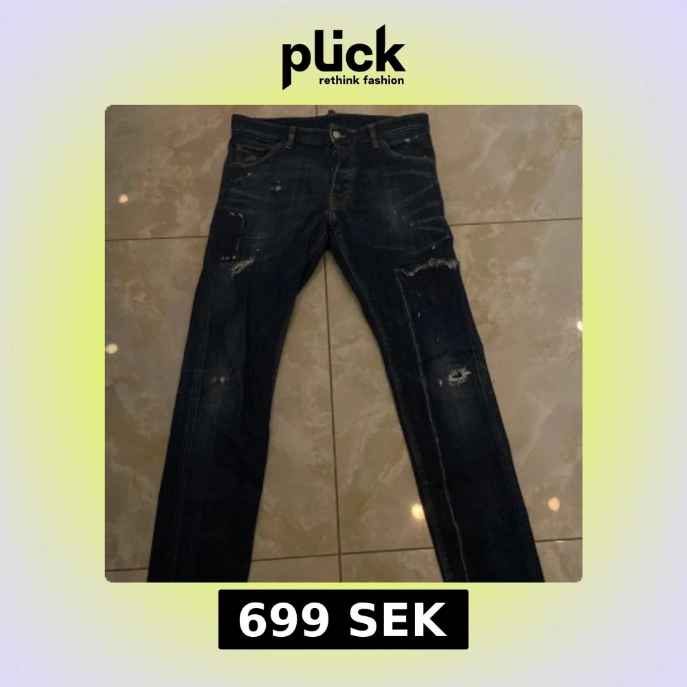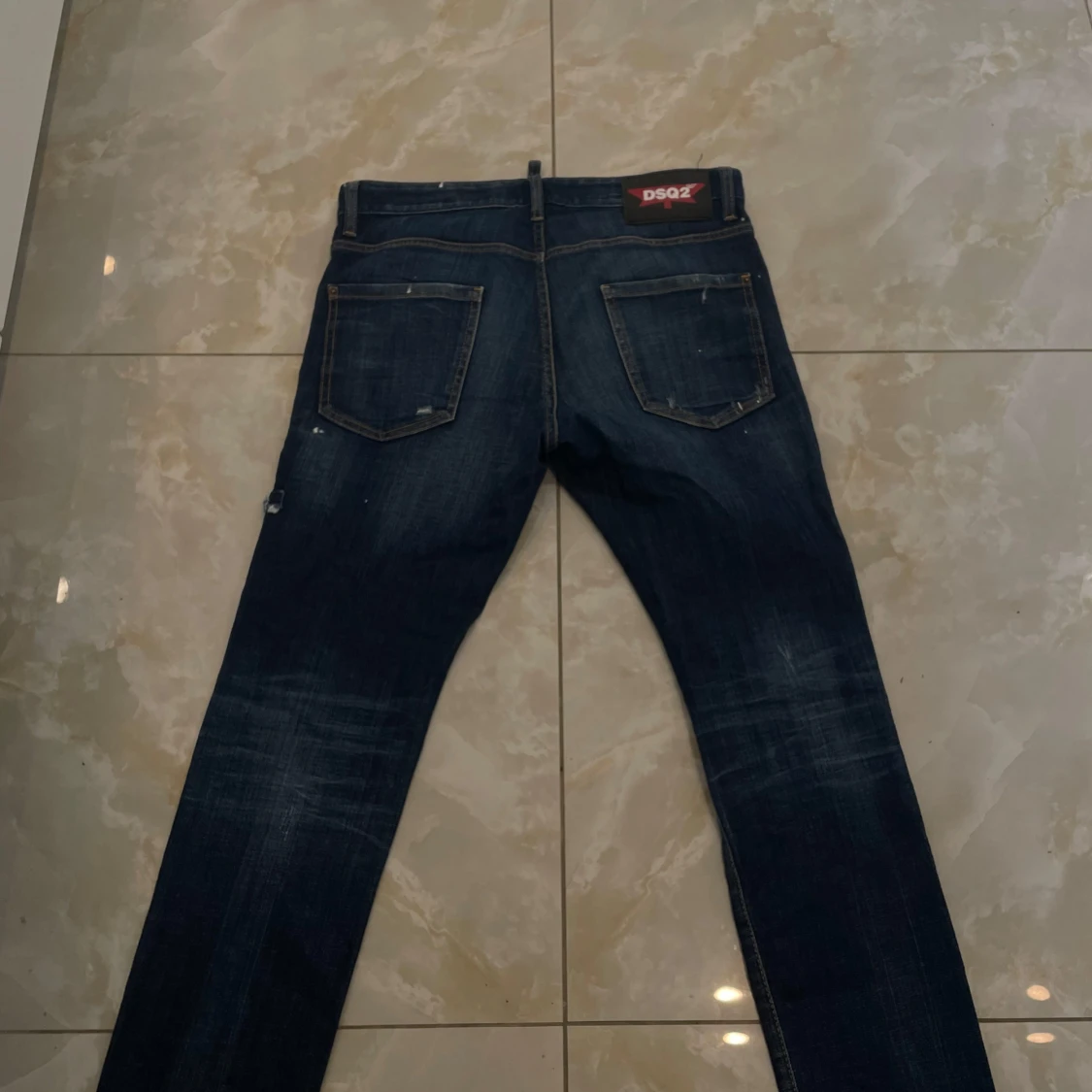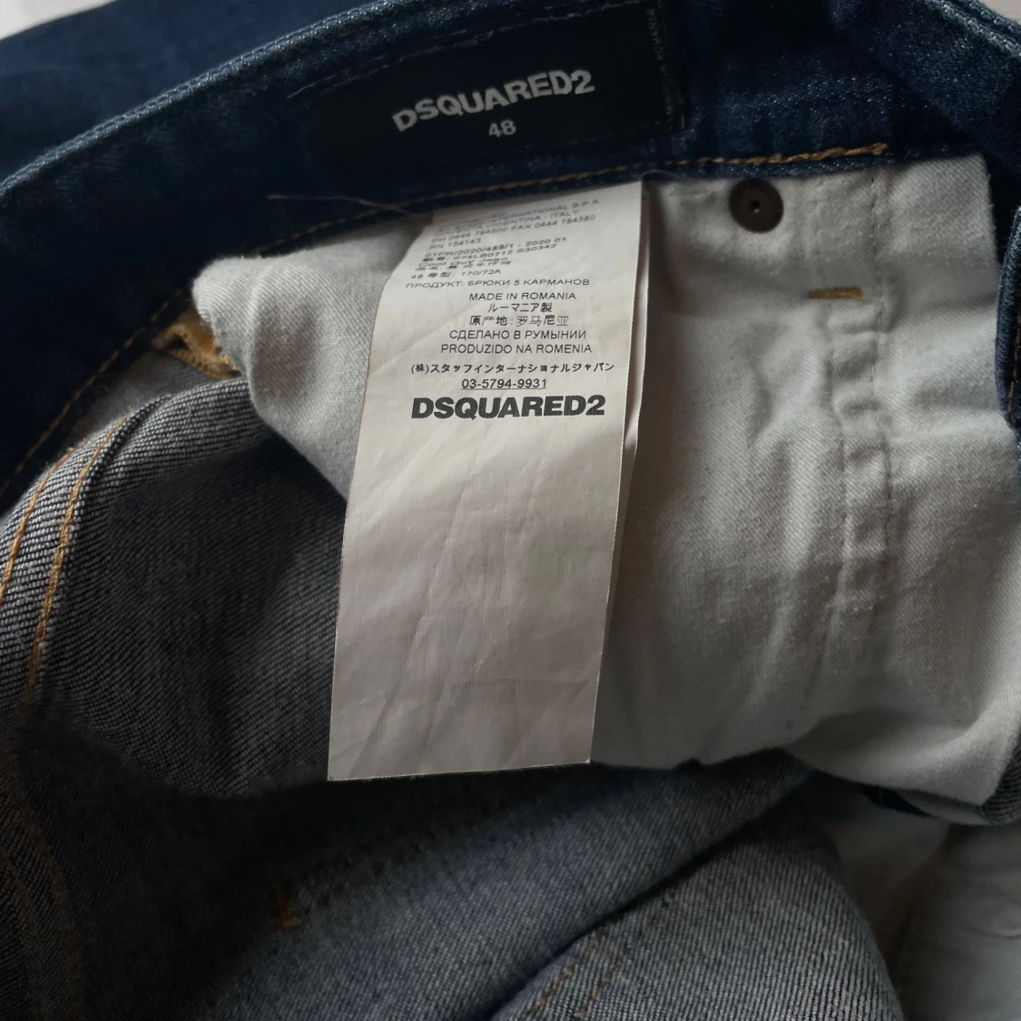 Säljer ett par snygga mörkblå jeans från Dsquared2 i storlek 48. Jeansen har slitna detaljer och små hål för en cool, edgy look. Klassisk femficksmodell med raka ben och tydliga kontrastsömmar. Materialet är robust denim i bomull.