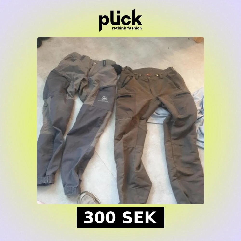 Säljer två par outdoorbyxor, ett par från Mackenzie och ett par från Kayoba Outdoor i storlek 48. Båda är i olika nyanser av grått och brunt, med flera dragkedjefickor och förstärkta partier på knän och bak. Perfekta för friluftsliv och äventyr.