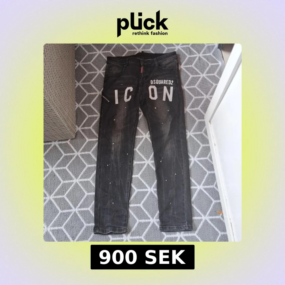Snygga svarta jeans från Dsquared2 med stor vit 'ICON'-print på baksidan och coola slitningar samt färgstänk. Kedjedetalj med Dsquared2-mynt vid fickan ger extra edge. Smal passform och klassisk femficksdesign. Perfekta för dig som vill sticka ut.