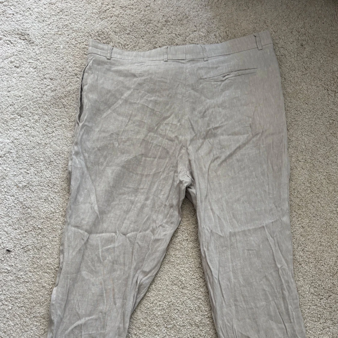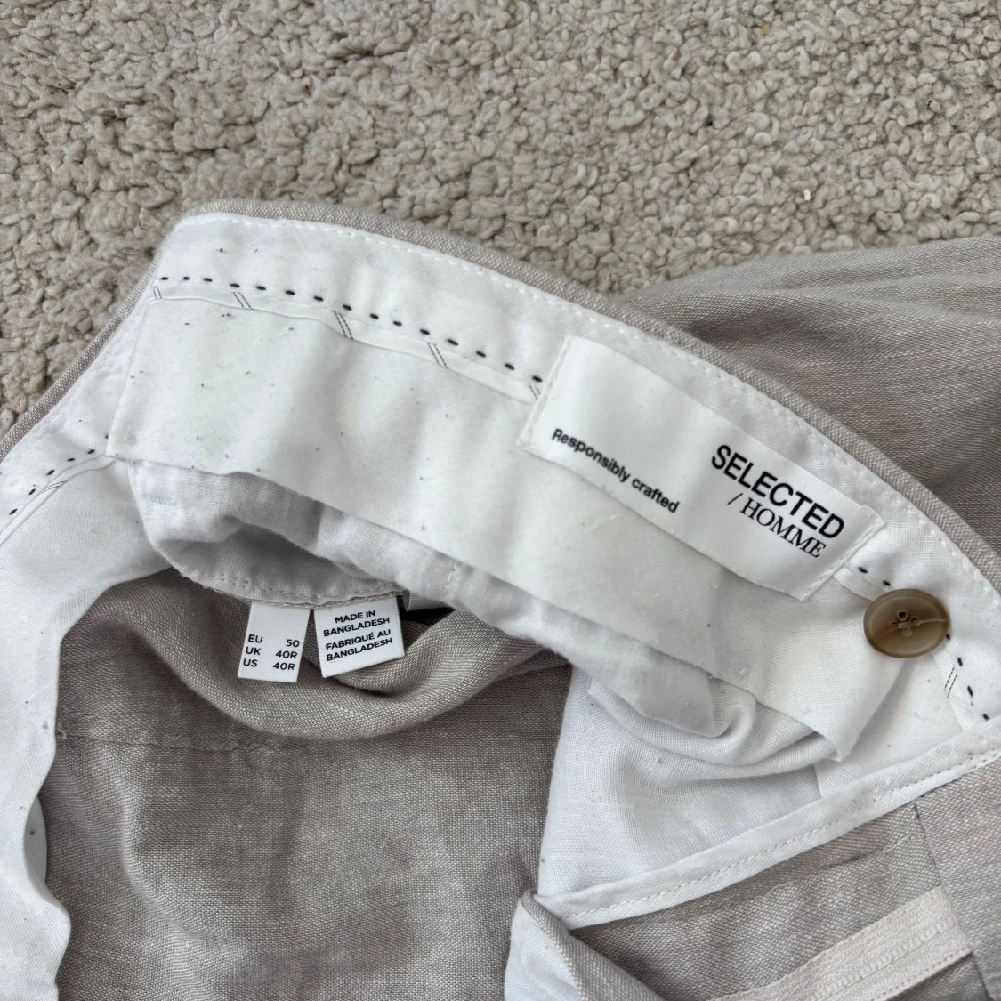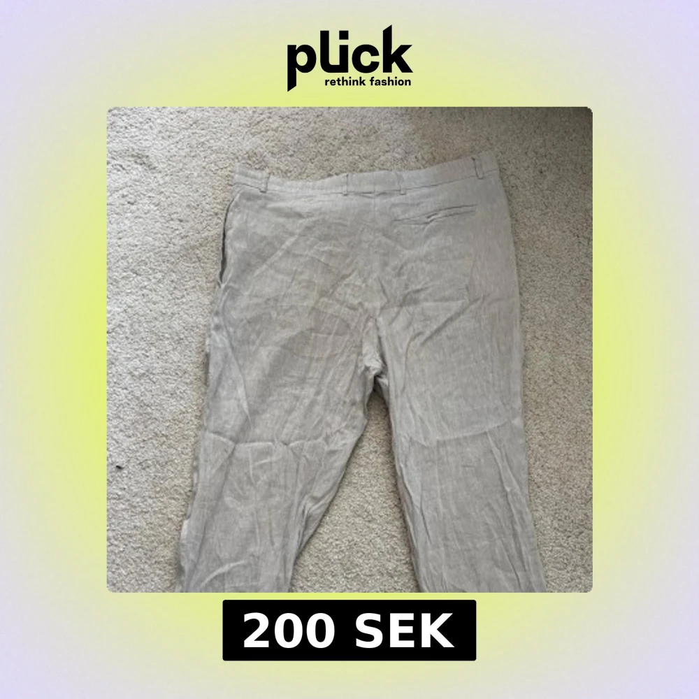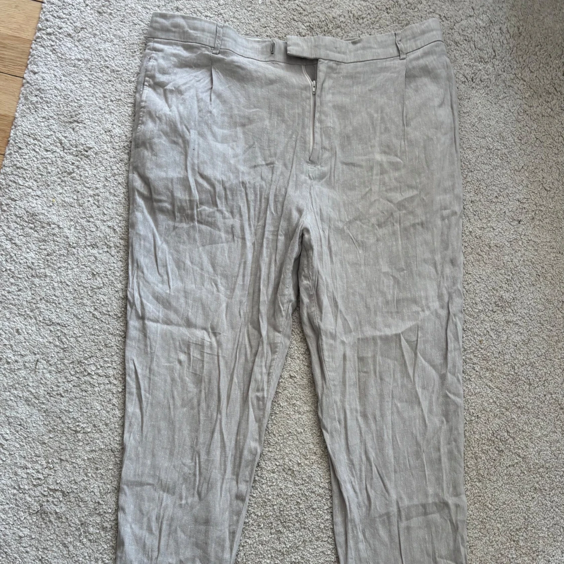 Säljer ett par ljusgråa linnebyxor från Selected Homme. Byxorna har normal passform, dragkedja och knapp i midjan samt diskreta fickor fram. Perfekta för varma dagar och en stilren look.