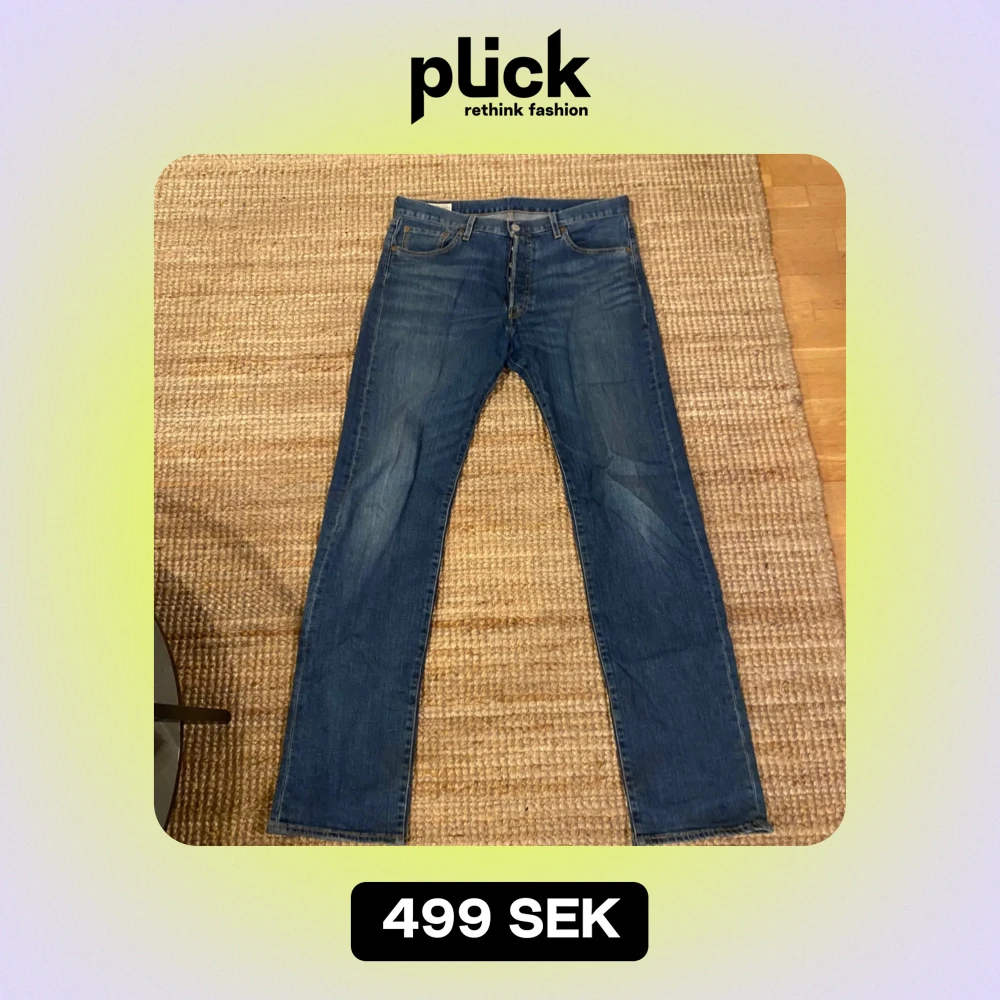 Säljer ett par klassiska Levis 501 jeans i blå denim. De har en straight passform och är i mycket bra skick. Perfekta för både vardag och fest! De har knappgylf och fem fickor. Passar till alla säsonger och är ett måste i garderoben.