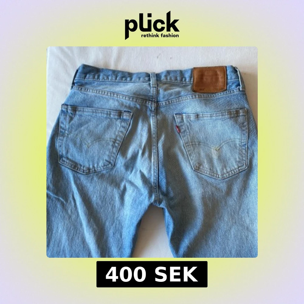Säljer ett par klassiska ljusa Levi's jeans med fem fickor och en knappgylf. De har en traditionell passform och är perfekta för en avslappnad stil. Levi's logotyp syns på den bruna läderpatchen baktill. Dem är lite större i storleken.
