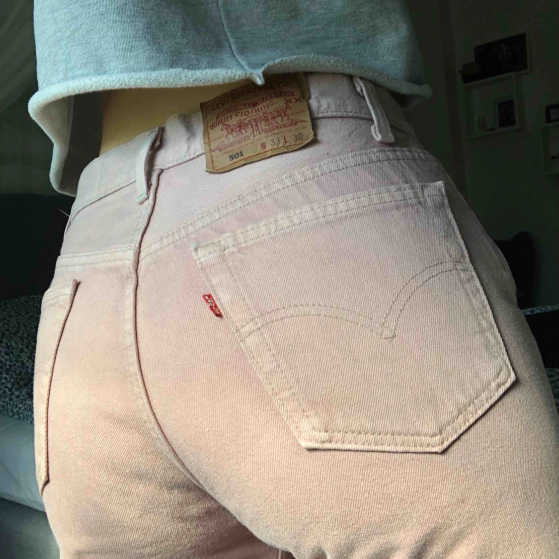 Ett par rosa Levi jeans! De är begagnade och väl använda av deras första ägare. De är lite urtvättade och noppriga samt har några fläckar. Dock är de i fint skick och jättesnygga på! Passar mig som har M i byxor bra.