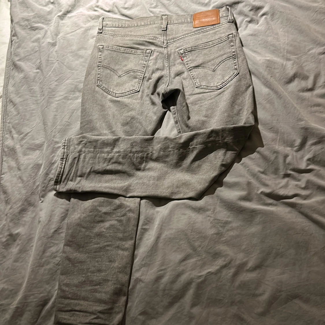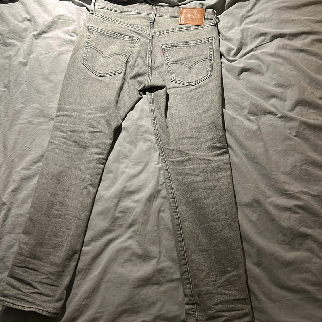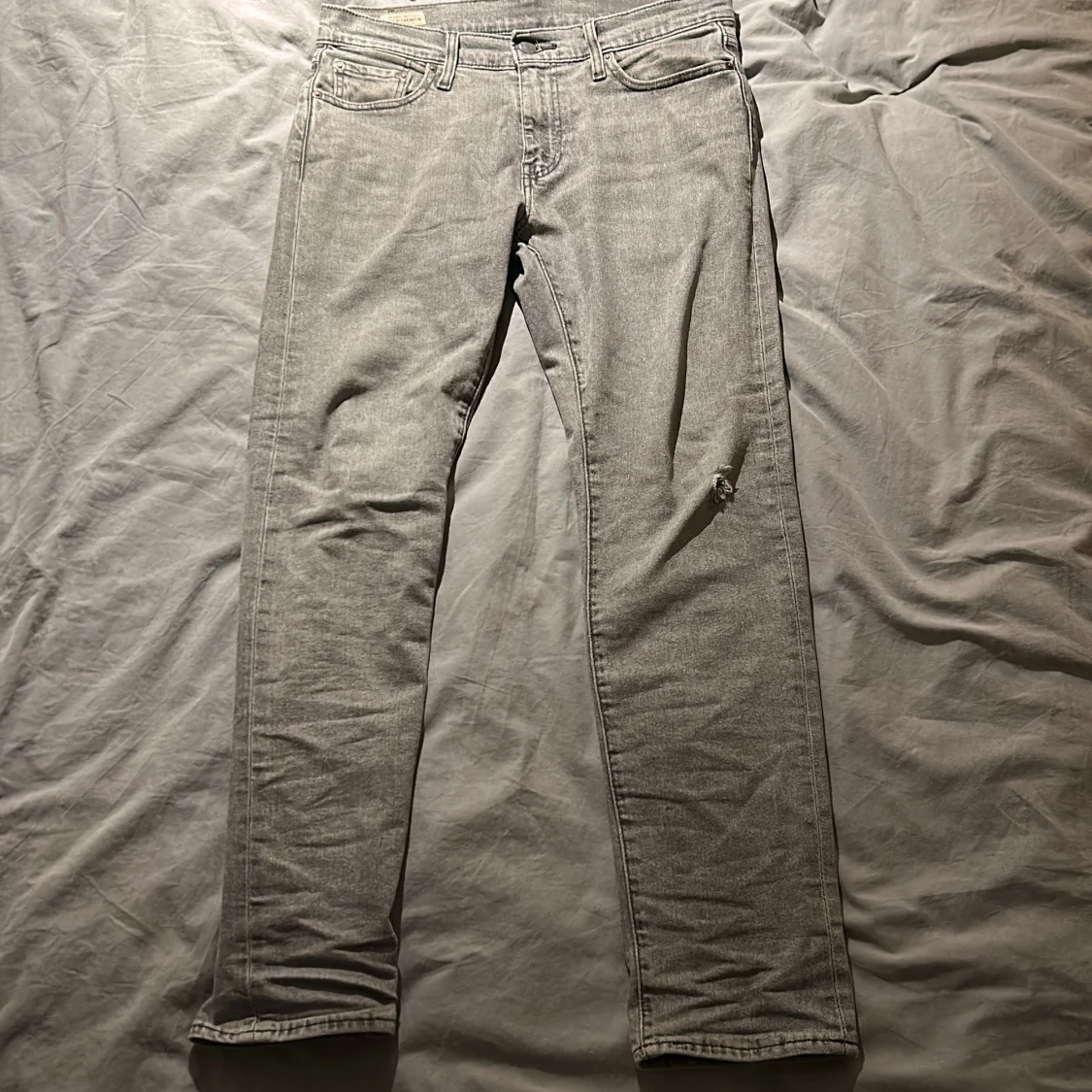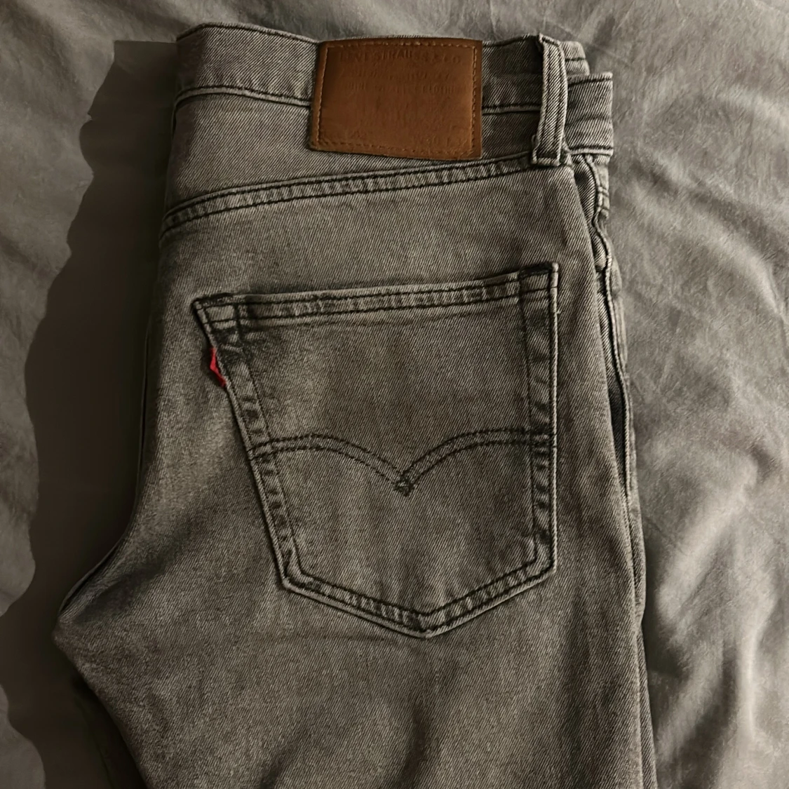 Snygga grå jeans från Levi's med klassisk femficksdesign och en liten reva på ena benet. De har en rak passform och är perfekta för en avslappnad stil. Levi's logotyp syns på den bruna läderpatchen baktill.