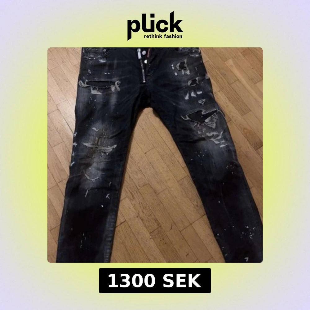 Säljer ett par svarta jeansbyxor från Dsquared2 i storlek 52. Byxorna har tydliga slitningar, färgstänk och en trendig, sliten look. Klassisk femficksmodell med knappgylf och raka ben.