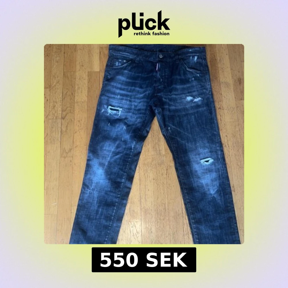 Säljer ett par mörkgrå jeans från Dsquared2 med slitna detaljer och lätt tvättad look. Byxorna har klassisk femficksdesign, knappgylf och Dsquared2-logga på röd etikett vid fickan. Perfekta för en trendig streetstil.