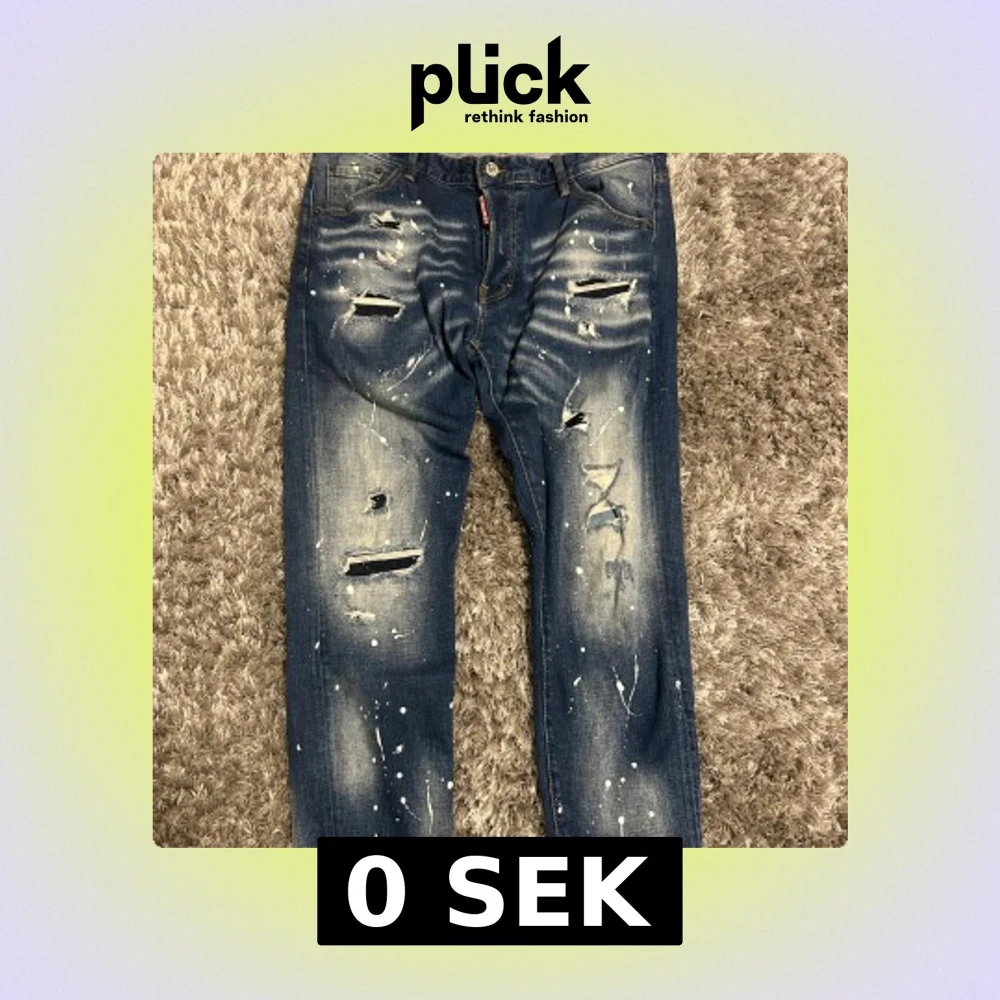 Säljer ett par blå jeans från Dsquared2 med slitna detaljer och färgstänk. Byter gärna mot andra jeans i lite mindre storlek De har en straight passform och klassisk femficksdesign. Perfekta för en edgy look! Använda Max 2-3 gånger