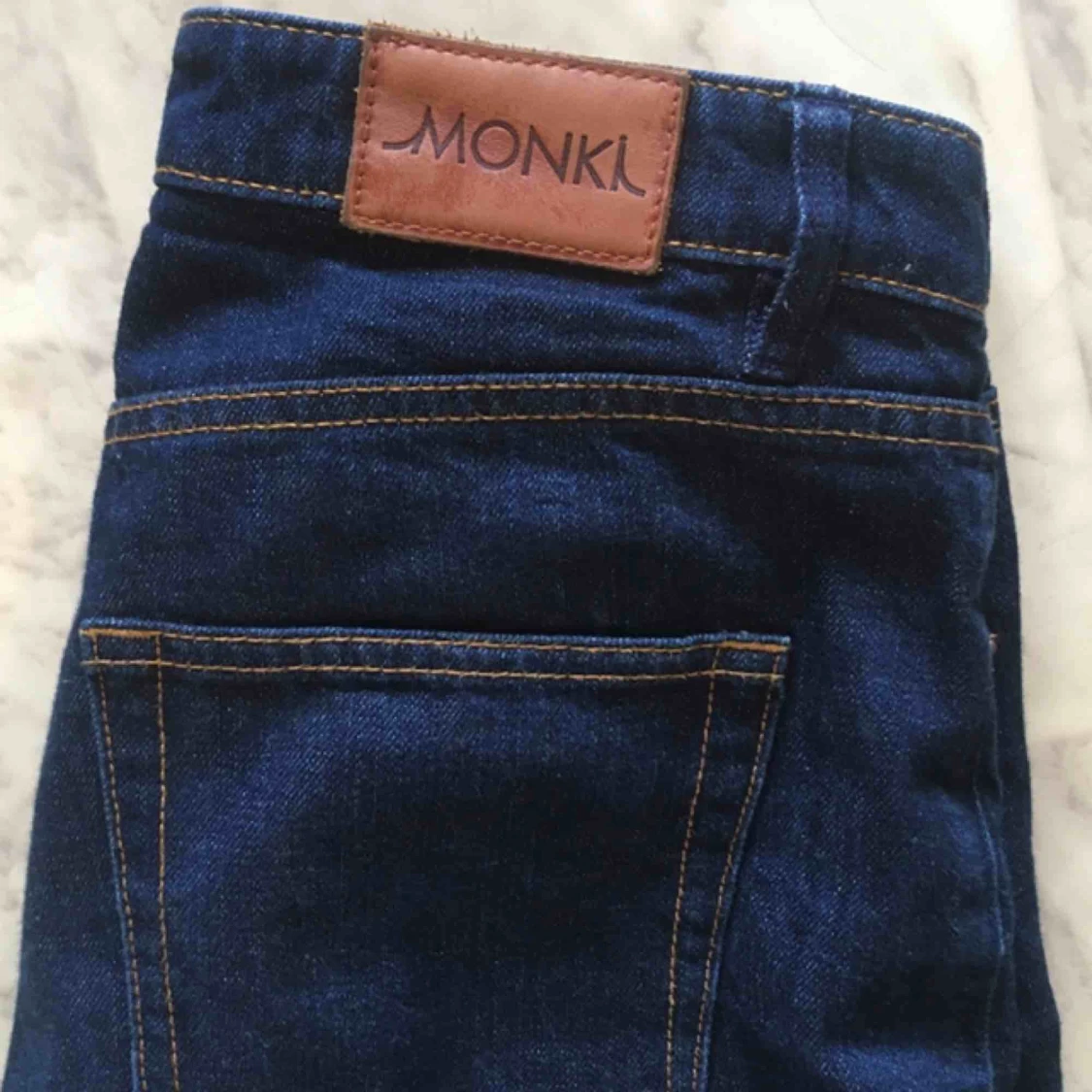 Utsvängda snygga, mörkblå monkijeans! Sparsamt använda pga för små. Passar som ankellånga för långisar eller hellånga för kortisar. Kan mötas i Malmö eller Gbg, annars tillkommer frakt på 50 kr.